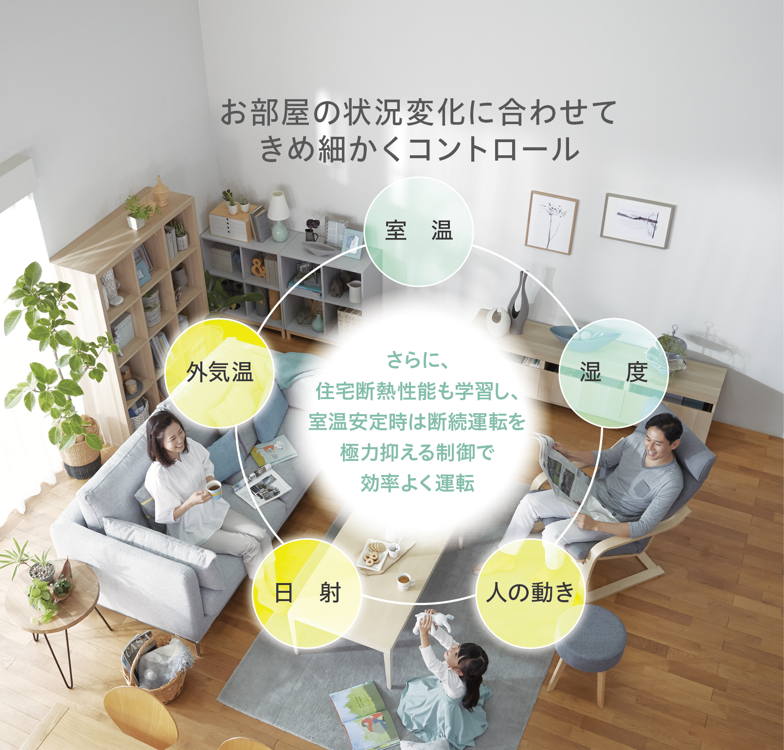 また、お部屋の状況は、さまざまな要因で変化します。「LAB制御」は、お部屋の人の動きや日差しの変化に合わせて、最低出力を細かく調整し、断続運転を抑える制御で効率よく運転を行うことで快適性にこだわっています。