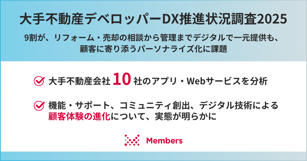 DX現場支援で顧客と共に社会変革をリードする株式会社メンバーズ(本社:東京都中央区、代表取締役社長:髙野 明彦、東証プライム:2130、以下「メンバーズ」)は、【大手不動産デベロッパーDX推進状況調査2025】を実施しました。本調査では、不動産デベロッパー10社を対象に、マンションや戸建てなど一般消費者向けの住宅アプリやWebサービスといったデジタル接点の利用実態を消費者目線で分析しています。