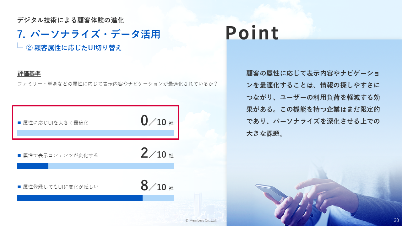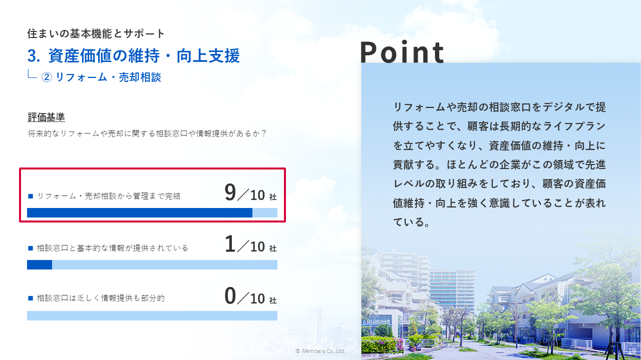 9割がリフォーム・売却の相談から管理までをデジタルで一元提供など、デジタル上でのサービスワンストップ化は進展。一方で10社全てが属性に応じた表示切替機能を未実装でパーソナライズ化に遅れが見られる。