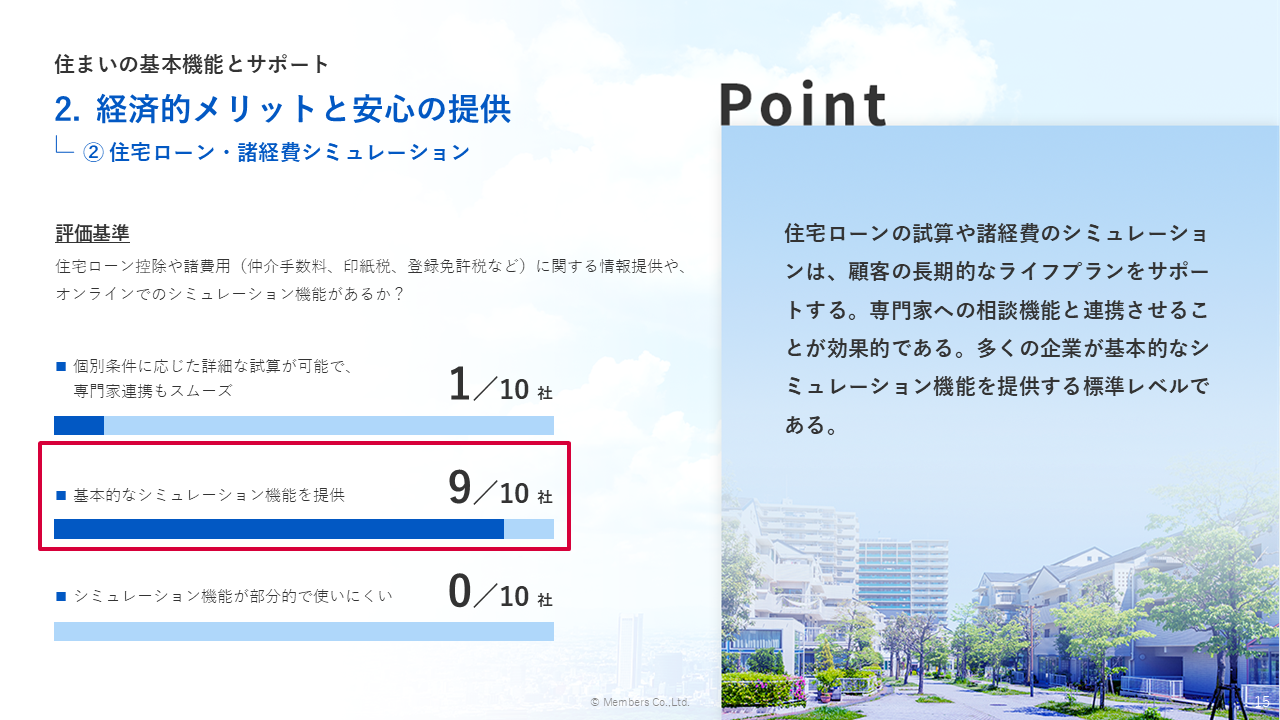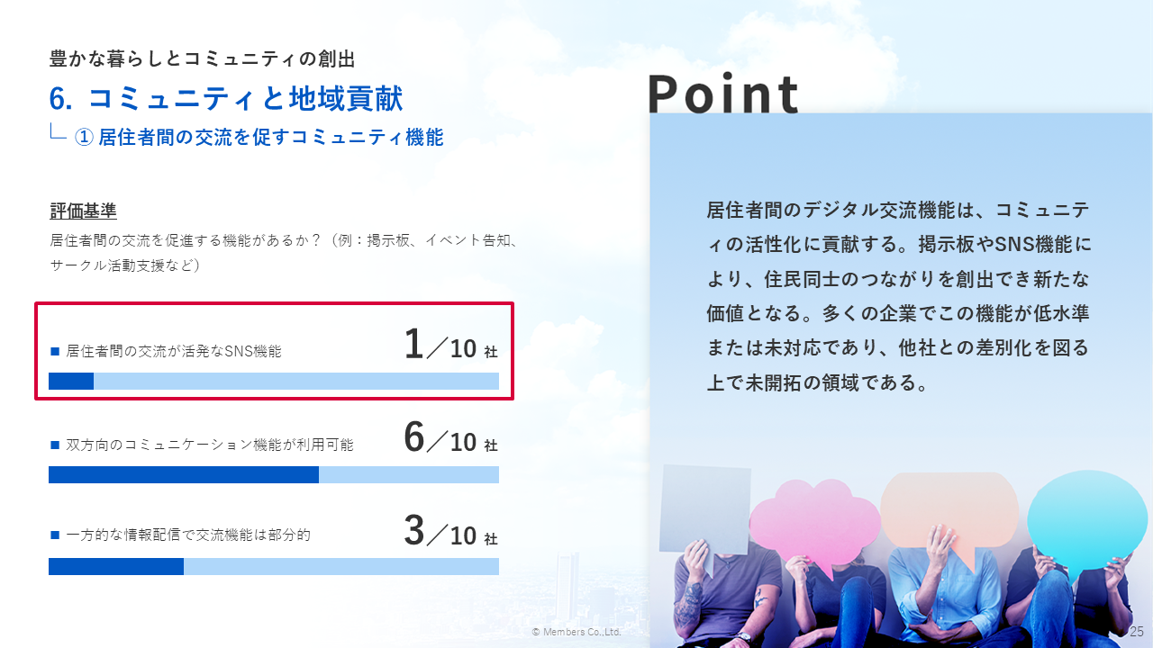 9割が住宅ローン・諸経費シミュレーション機能を提供するなど、モノの資産価値を支える機能は充実。一方、リアルとデジタルを繋いで居住者間の交流を促すコミュニティ機能は1社のみの実装に留まるなど、コト体験の強化が課題となっている。