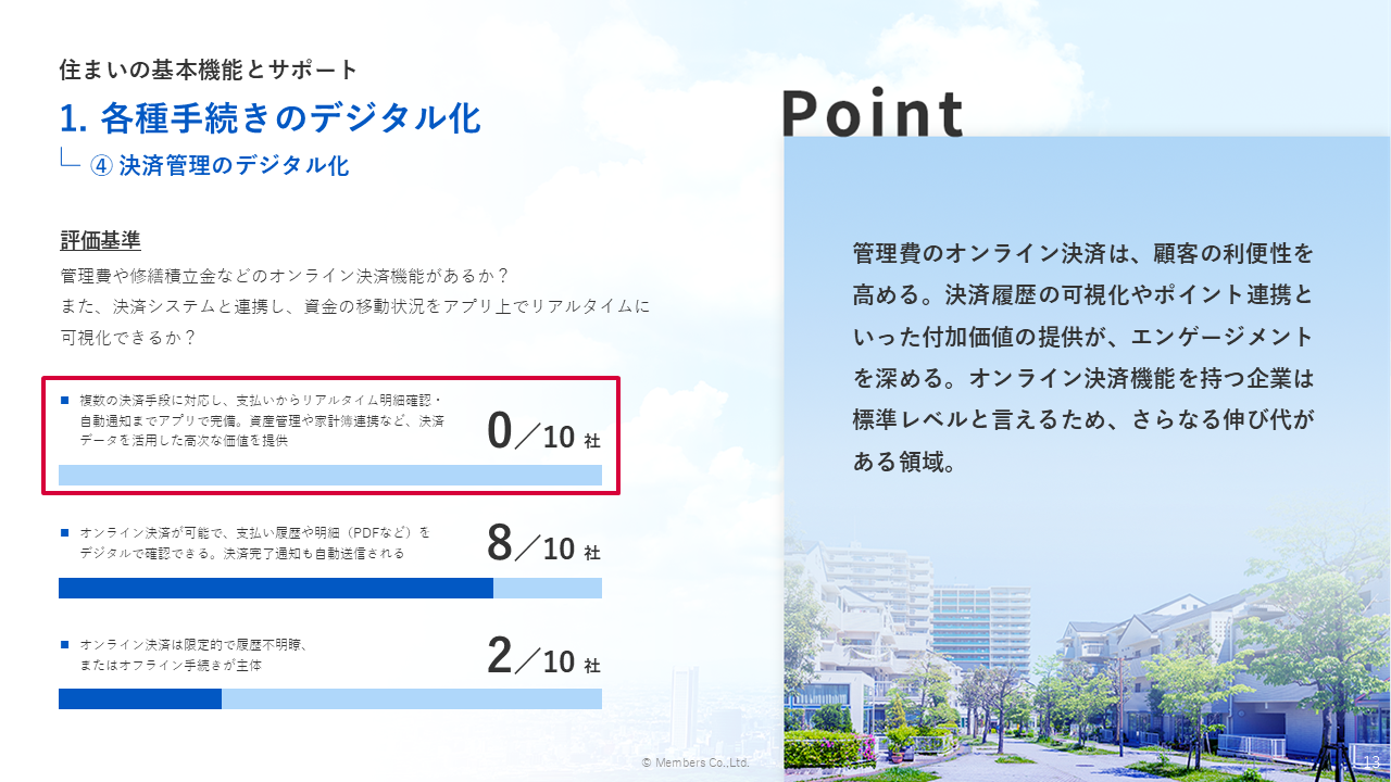 管理費や修繕積立金の支払いにおける、複数決済手段対応や明細のリアルタイム確認といった機能は10社全てが未整備。デジタル接点は、単なる情報提供が中心となっており、顧客との関係を深めるためにシームレスなデジタル体験の提供が求められる。