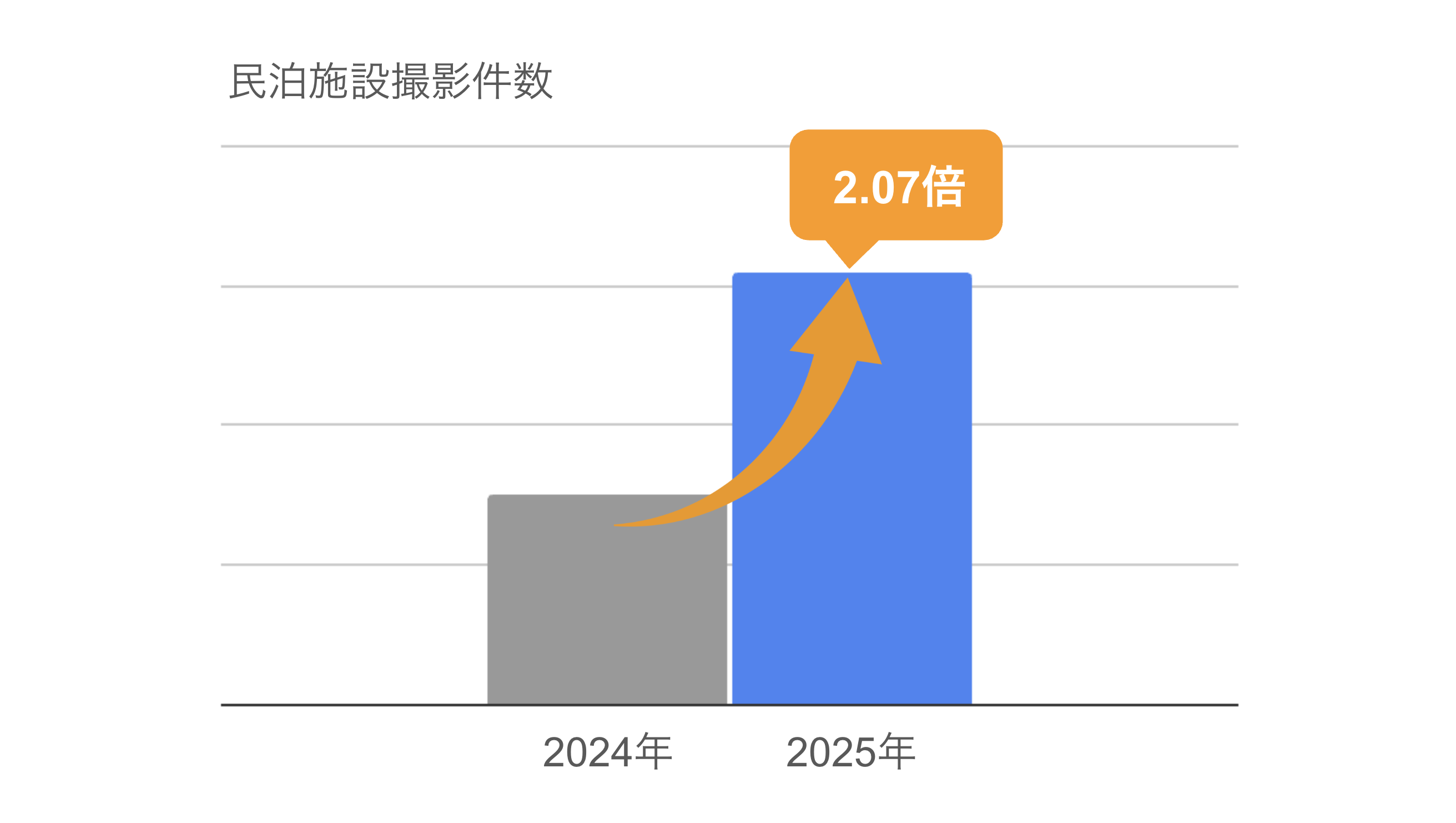PIXTAオンデマンドに寄せられた2024年9月~2025年8月における民泊施設撮影依頼件数は、前年比207%と大きく増加しました。