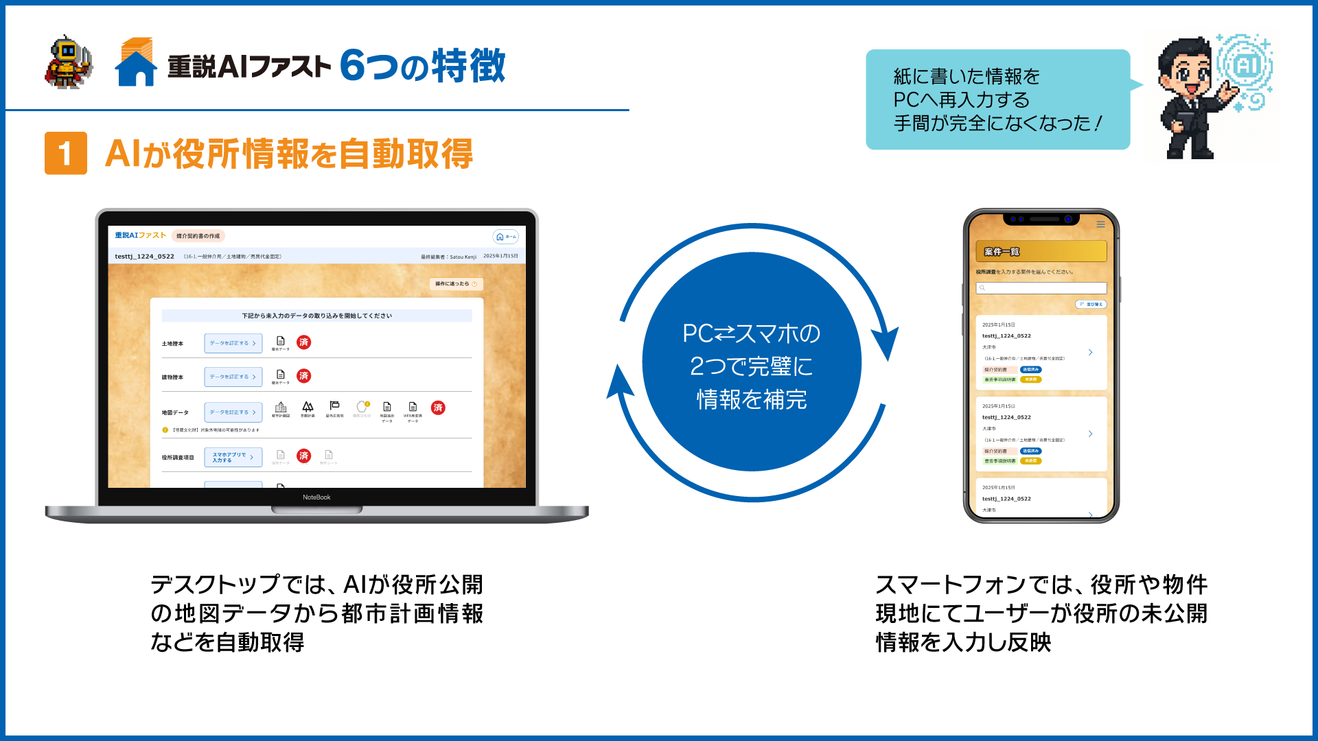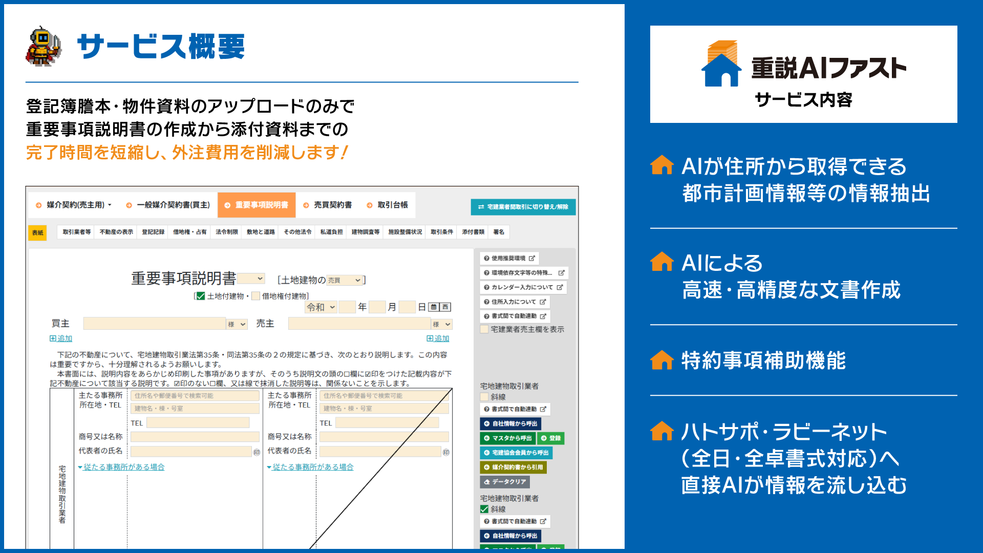 今回リリースした「重説AIファスト」は、そうした現場の実態と真摯に向き合い、「本当に必要なところに時間を使ってほしい」という想いから生まれました。