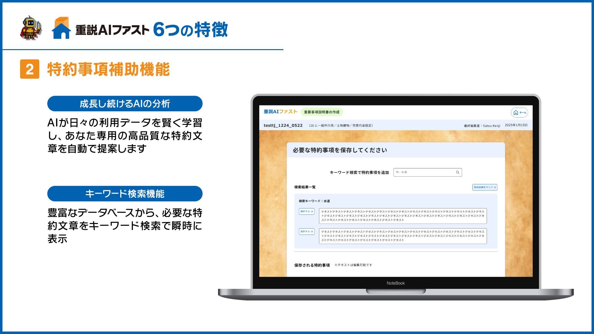 AIがこれまでの入力履歴や業務特性を学習し、最適な特約文章を自動提案。さらに、キーワード検索機能により、必要な文言をデータベースから即座に表示できます。属人的になりがちな特約の品質を、