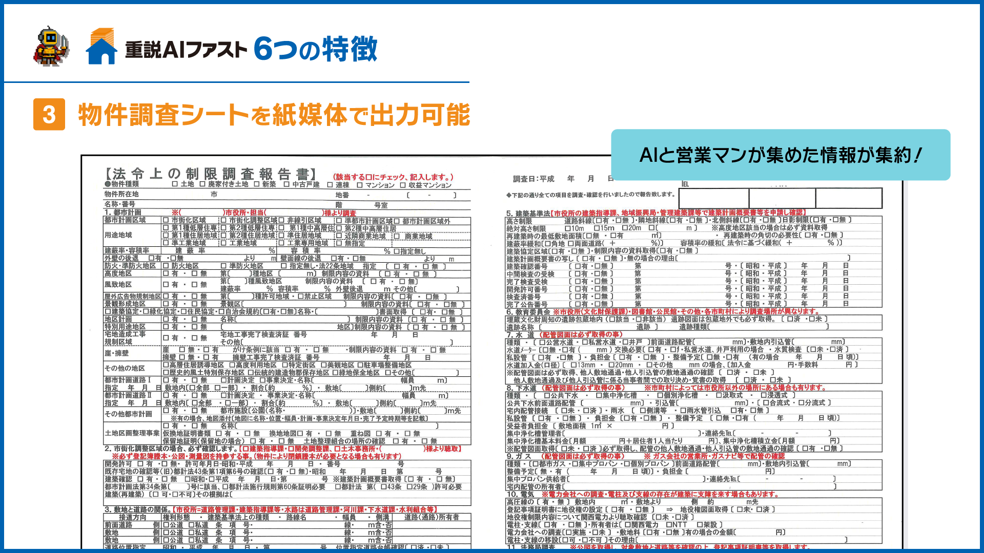 収集した調査情報を紙の調査シート形式で出力可能。営業マンが現地で集めた情報とAIの解析結果が一つの書類に集約されるため、情報伝達がスムーズかつ明確になり、社内業務の効率も飛躍的に向上します。
