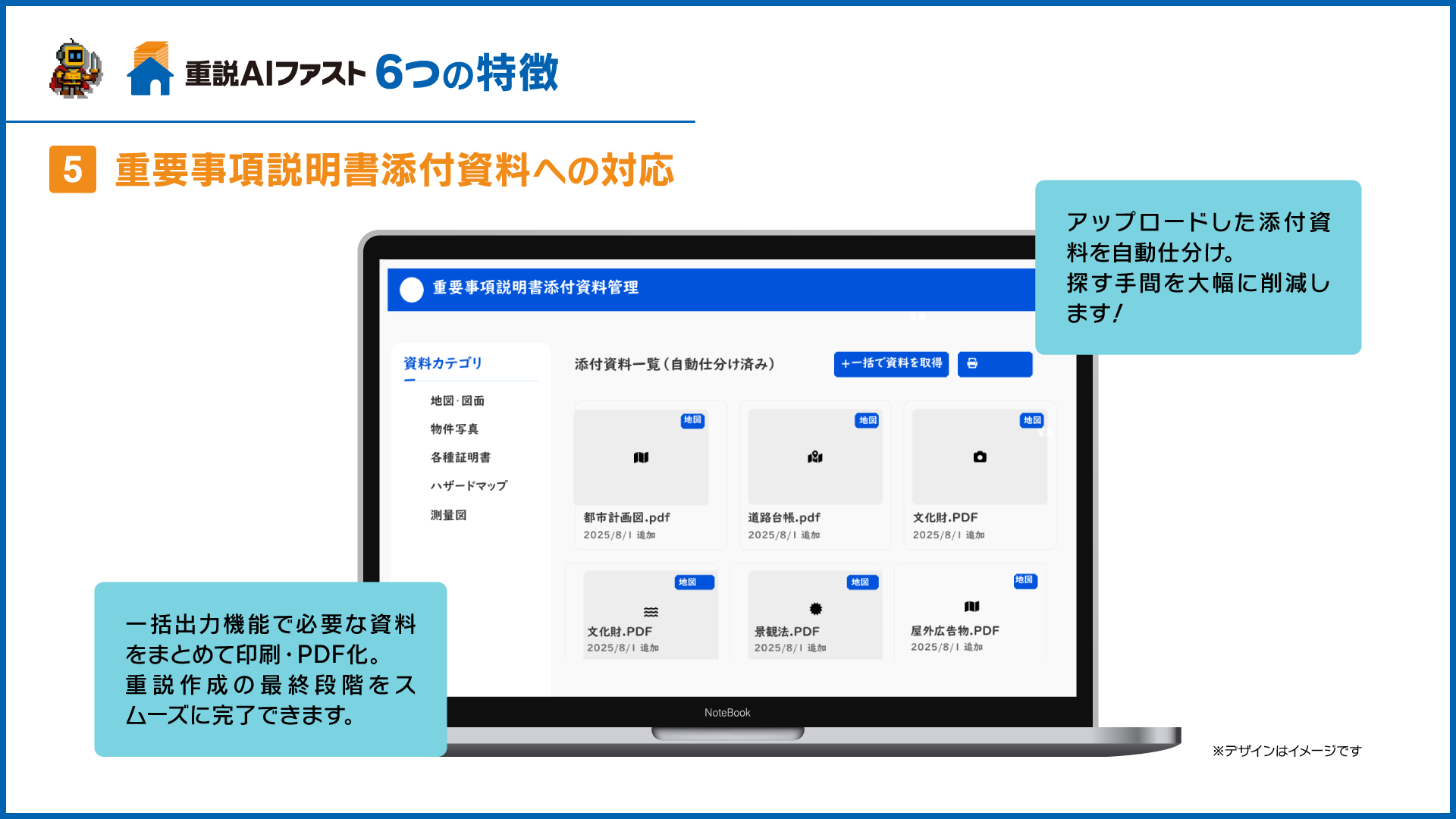 面倒な資料の取り寄せや整理作業を大幅に削減し、重説作成の最終工程の手間をゼロに近づける革新的な機能です。