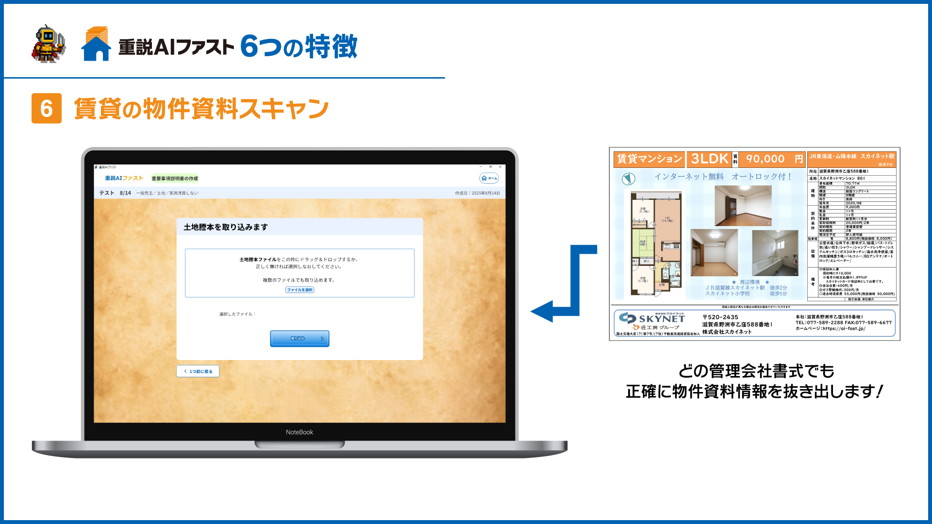 どんな管理会社の書式であっても、物件資料から正確に情報を読み取り、書式へ自動反映。AIによるスキャンで、物件情報の入力ミスを防ぎ、スピーディーなデータ反映を実現します。