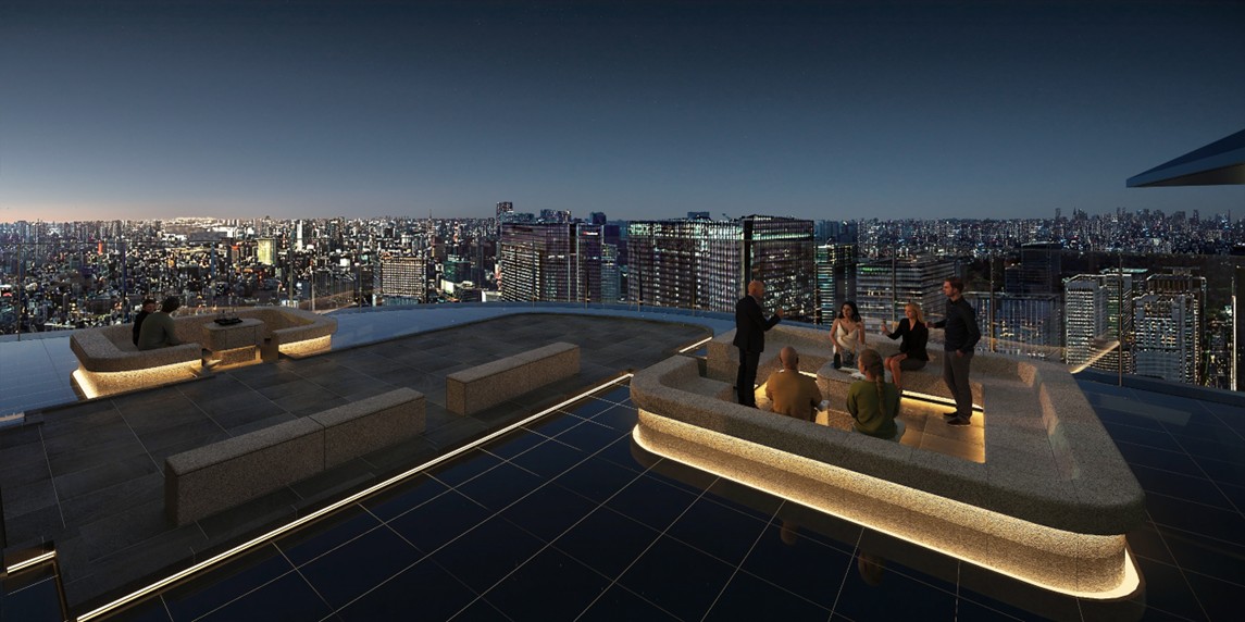 パーティーラウンジでは、併設したキッチンでお料理を楽しむことはもちろん、「ウォルドーフ・アストリア東京日本橋」のケータリングサービス等を利用し、ご家族や友人と特別なひとときをお過ごしいただけます。また、50階ラウンジ一面に広がる屋外テラスは、地上約250mから見渡す圧倒的な眺望と開放感を存分に感じられる空間となります。さらにパーティーラウンジ前のテラスには造り付けのテーブルとベンチを設え、都心を一望しながらプライベートテラスでパーティーをお楽しみいただけます。