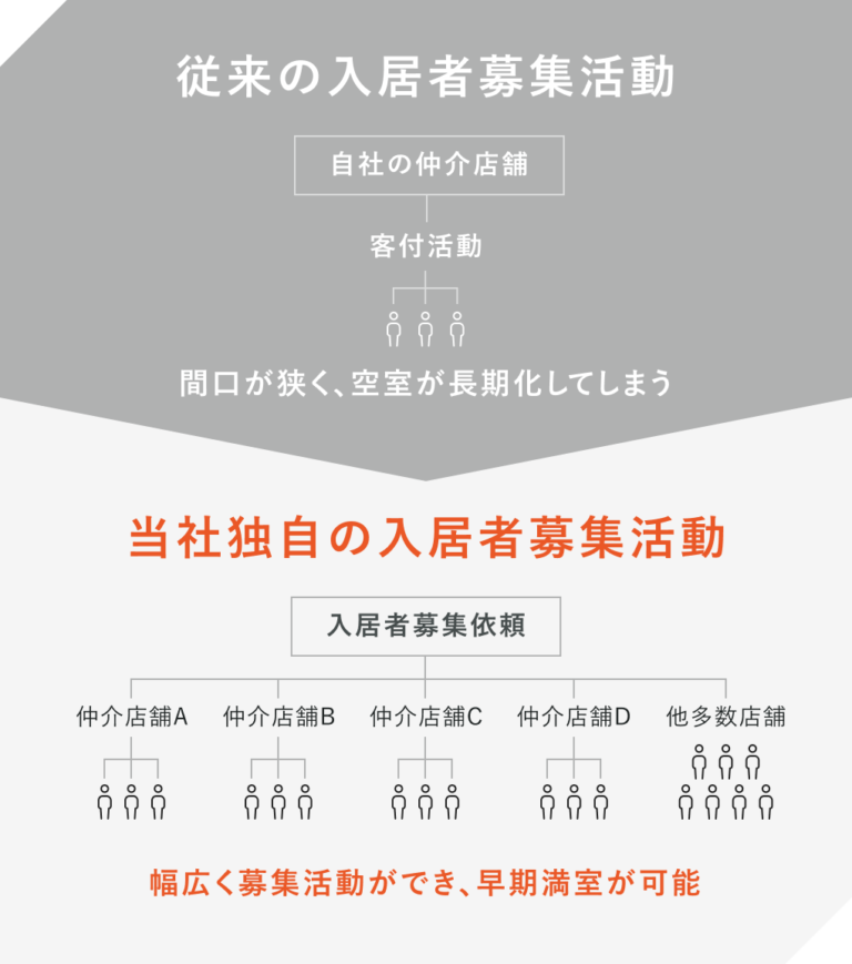 仲介店舗を持たず賃貸管理に特化することで、一般的な管理会社よりも圧倒的に幅広く周知でき、空室対策を行っています。さらに賃貸営業からの信頼獲得のため、日常的な店舗への直接訪問、広告料の全額支払い、専用サイトによる情報提供などを行うことで、優先的に物件をご紹介いただいています。