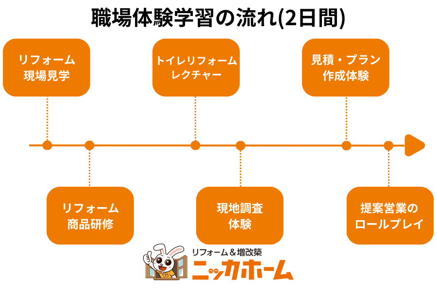 本プログラムでは、リフォーム会社ならではの「現地調査」「見積り作成」「商品提案」といった一連の流れを、実際の新人営業スタッフと同じプロセスで体験。