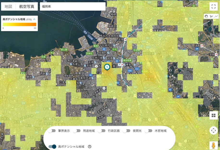 夜間に地表から放たれる光を人工衛星で観測した「衛星夜間光データ」から経済活発度指標を導出し、購買力は高い一方で地価がそれほど高くない「ポテンシャル不動産」のマッピング機能を搭載しました(詳しくはこちら)。