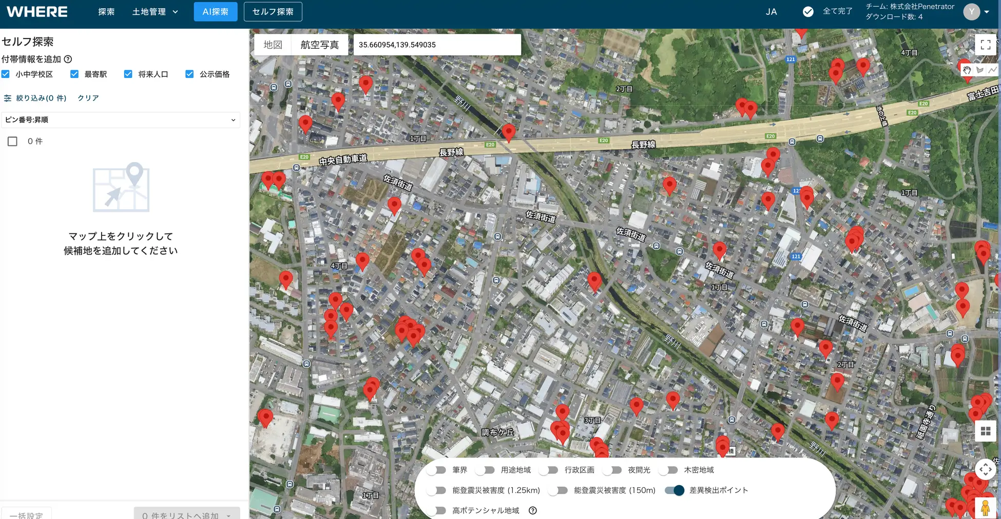 『WHERE』は、人工衛星が撮影した「衛星データ」とAIを活用することで、不動産の探索から評価・管理・アプローチまで一貫して支援するサービスです。2024年9月13日のリリースから約1年間、不動産の仕入れ・人材課題を解消し、地権者とつながる不動産AIツールとして数多のアップデートを重ねてまいりました。