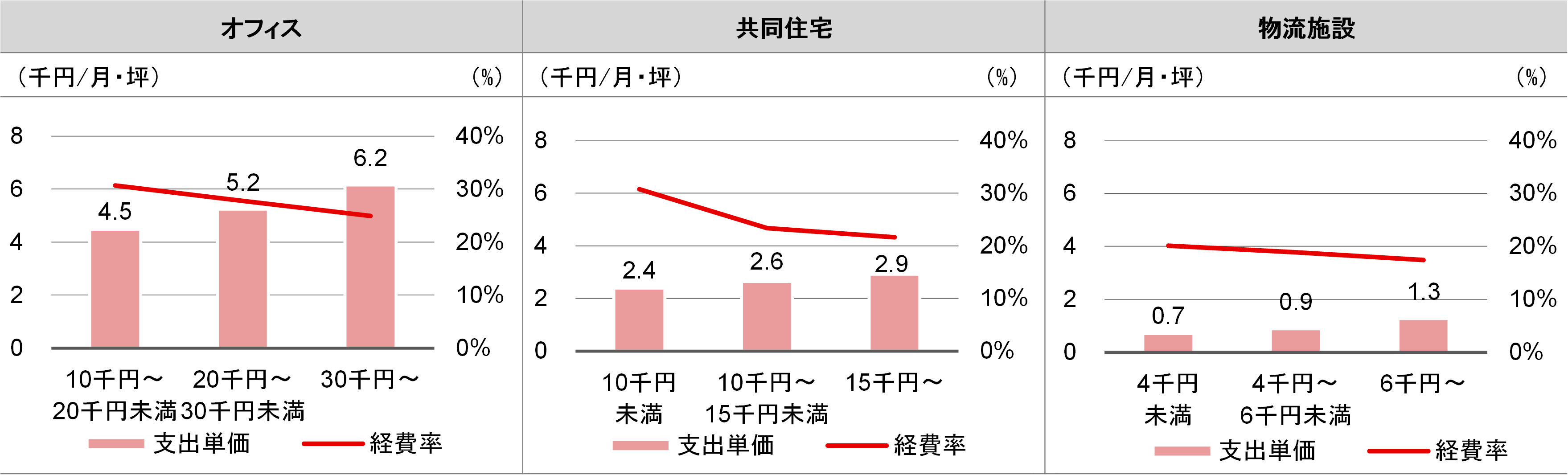 すべての用途において、賃料高価格帯は経費率が低く、収益性の観点からは優位な傾向