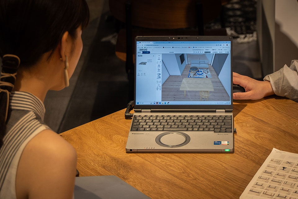コーディネートする家具や雑貨をセレクトするため、クラッシュゲート横浜みなとみらい店を訪問。ソファの座り心地を確かめたり、スタッフと3Dシミュレーターでレイアウトを検討したりするなど、丁寧なプロセスを経てプランを仕上げました。
