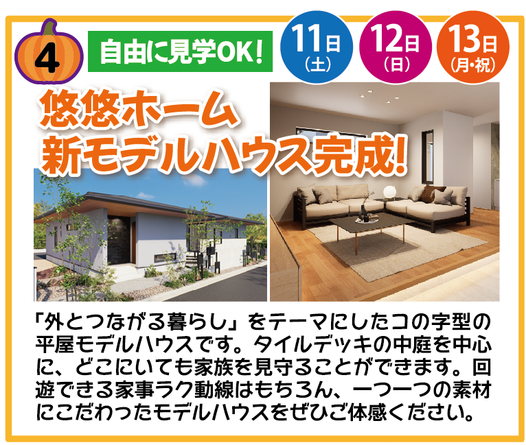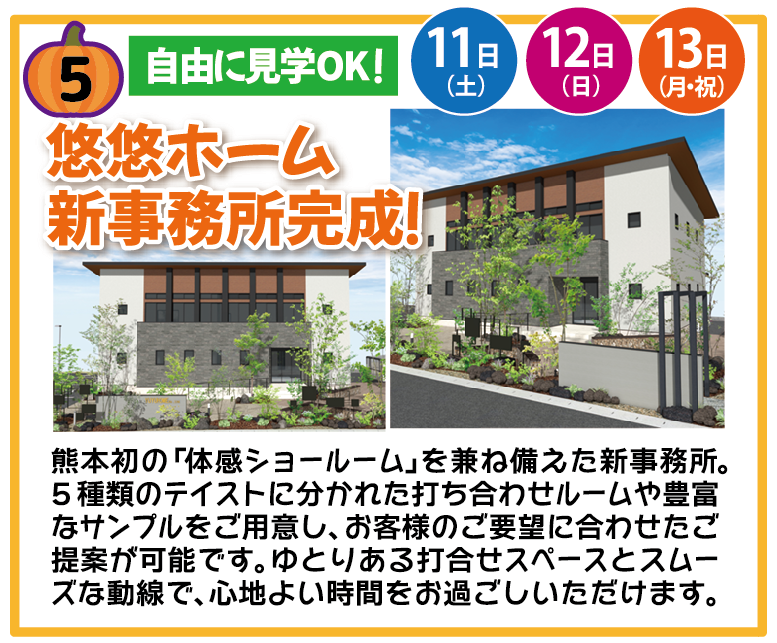 悠悠ホーム株式会社(本社:福岡県大野城市)は、熊本県上益城郡嘉島町に新展示場をオープンし、その記念イベントを2025 年10 月11 日(土)~13 日(月・祝)の日程で開催いたします。 本イベントでは、飲食・体験コンテンツや、豪華健康アイテムが当たるSNS キャンペーンを通じて、地域の皆さまと「暮らしと健康の新しい関わり方」を共有します。さらに10月13日には健康と美容に詳しい地元ゲスト・渕上彩夏さんが登場し、「住まいとウェルビーイング」を紹介するライブ配信も予定。地域の健康志向や生活文化を伝える最適な機会となります。