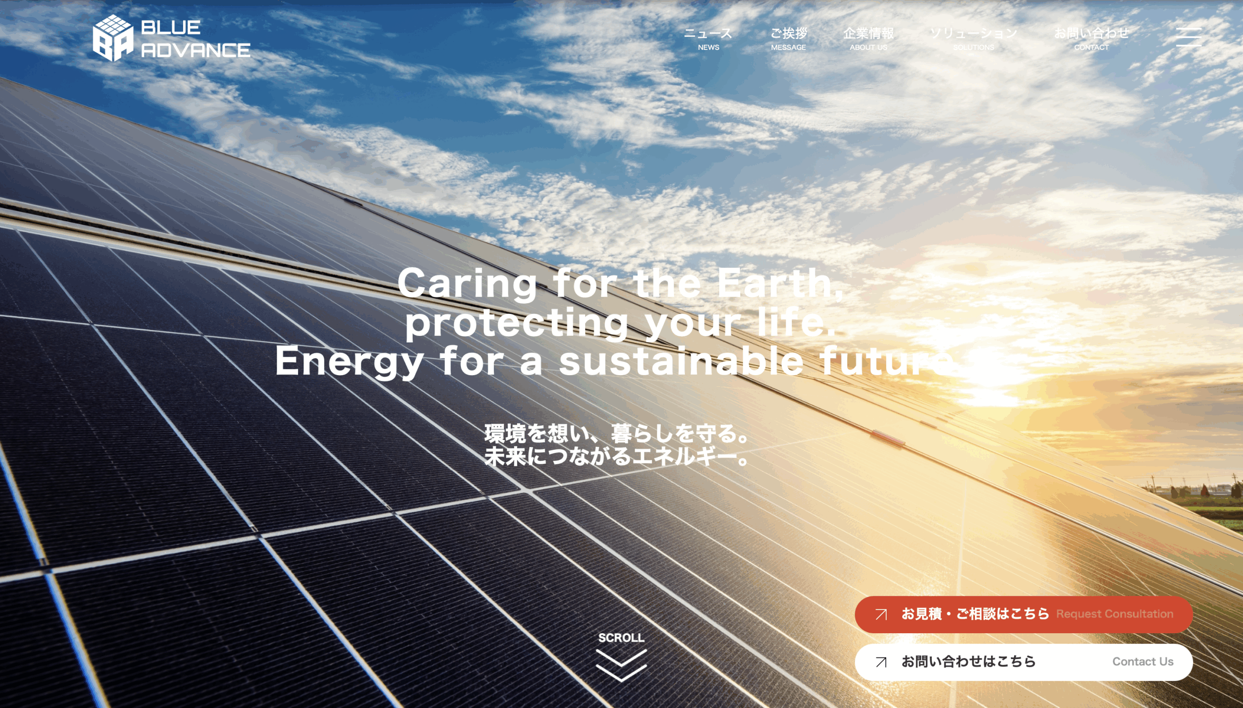 地球温暖化対策やエネルギーコストの上昇を受け、再生可能エネルギーへ注目がますます高まる中で、住宅用太陽光発電と蓄電池の需要も急増しています。ブルーアドバンスでは、お客様に安心と信頼を提供することを最重要と考え、情報公開の充実と運営体制の強化を目的として今回のウェブサイトリニューアルを実施しました。