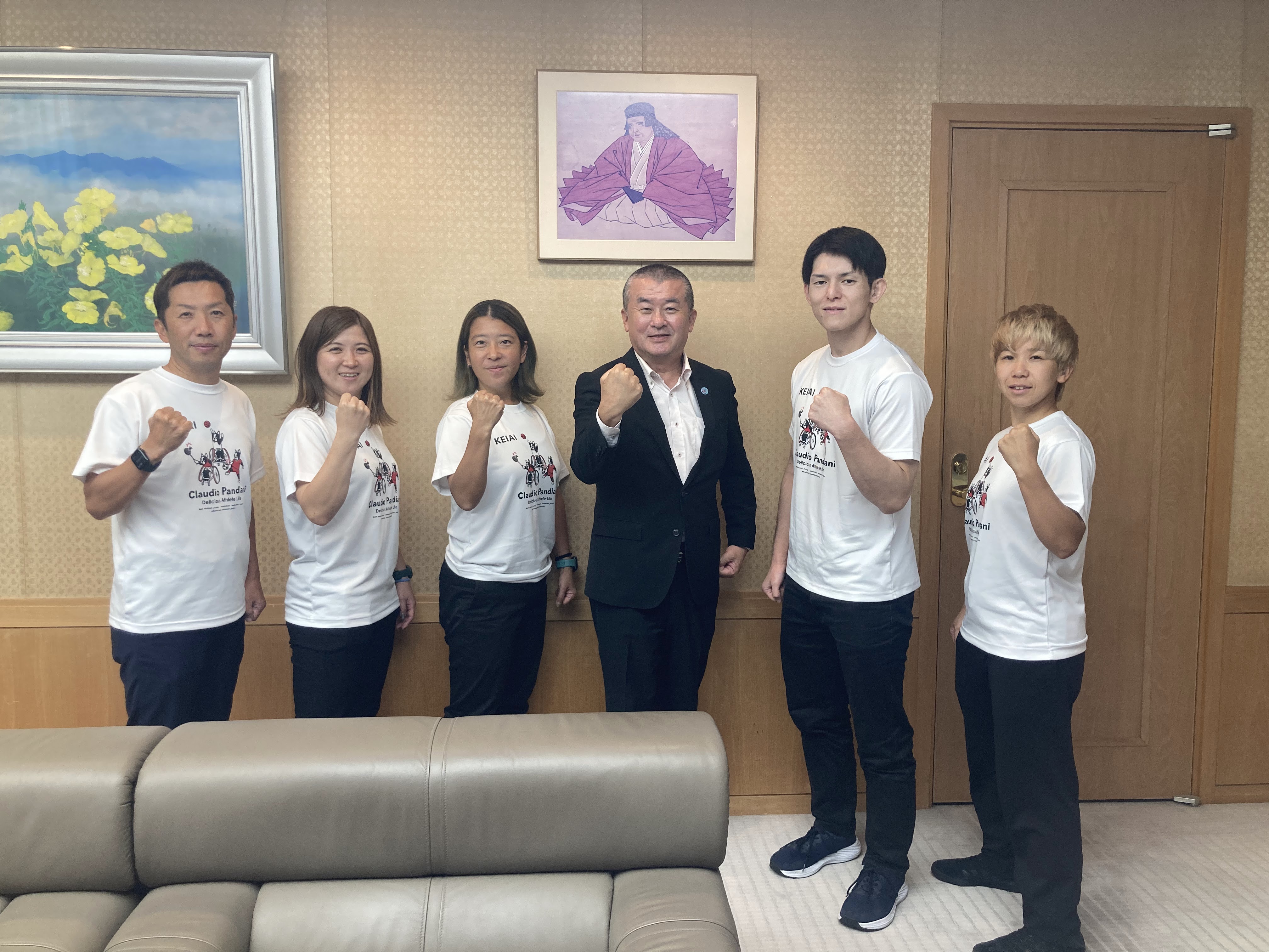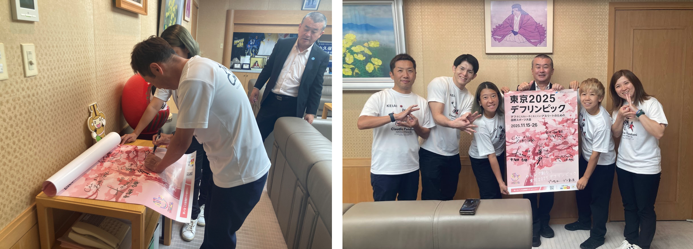 当日は、ケイアイチャレンジドアスリートチームから東京2025デフリンピックに向けての現在のトレーニングの様子や、大会の意気込みをご報告し、吉田市長からは5名の選手と監督に向けて労いの言葉をいただきました。
