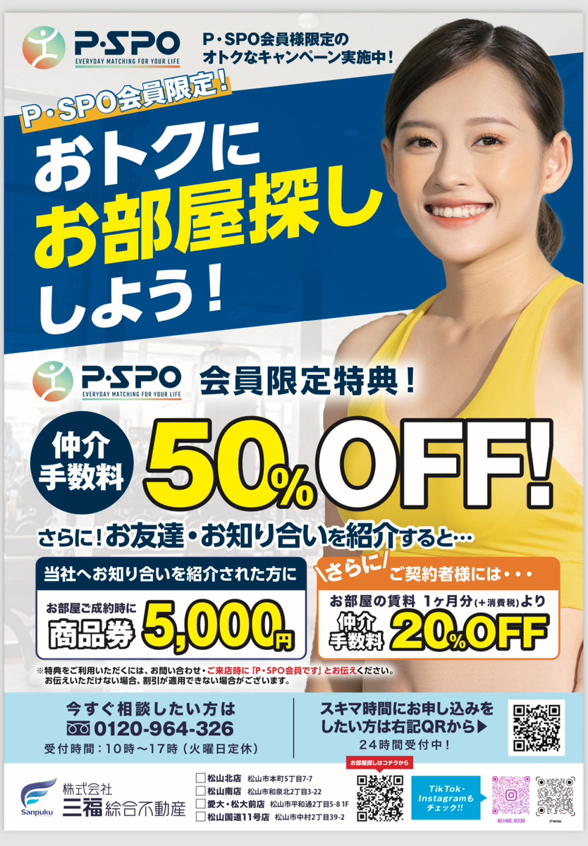 P・SPO会員様限定「おトクにお部屋探ししよう!」キャンペーンでは、三福綜合不動産が運営するアパマンショップ3店舗(松山北店・松山南店・松山国道11号店)にて、賃貸マンション・アパートをご契約いただく際の仲介手数料が50%OFFとなります。