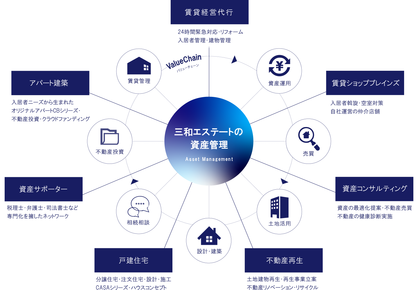 三和エステートでは「最適な資産管理」を基本に、お客様のライフステージに応じた「購入」「売却」「投資」「運用」「相続」など多様なニーズにお応えしています。従来型の資産運用だけでは理想の未来を描くことが難しいとされる今、私たちは「最適な時期」に「最適な判断」からなる「最適な方法」で、お客様の大切な資産を最適化し、収益不動産を通じて資産の最大化を目指します。