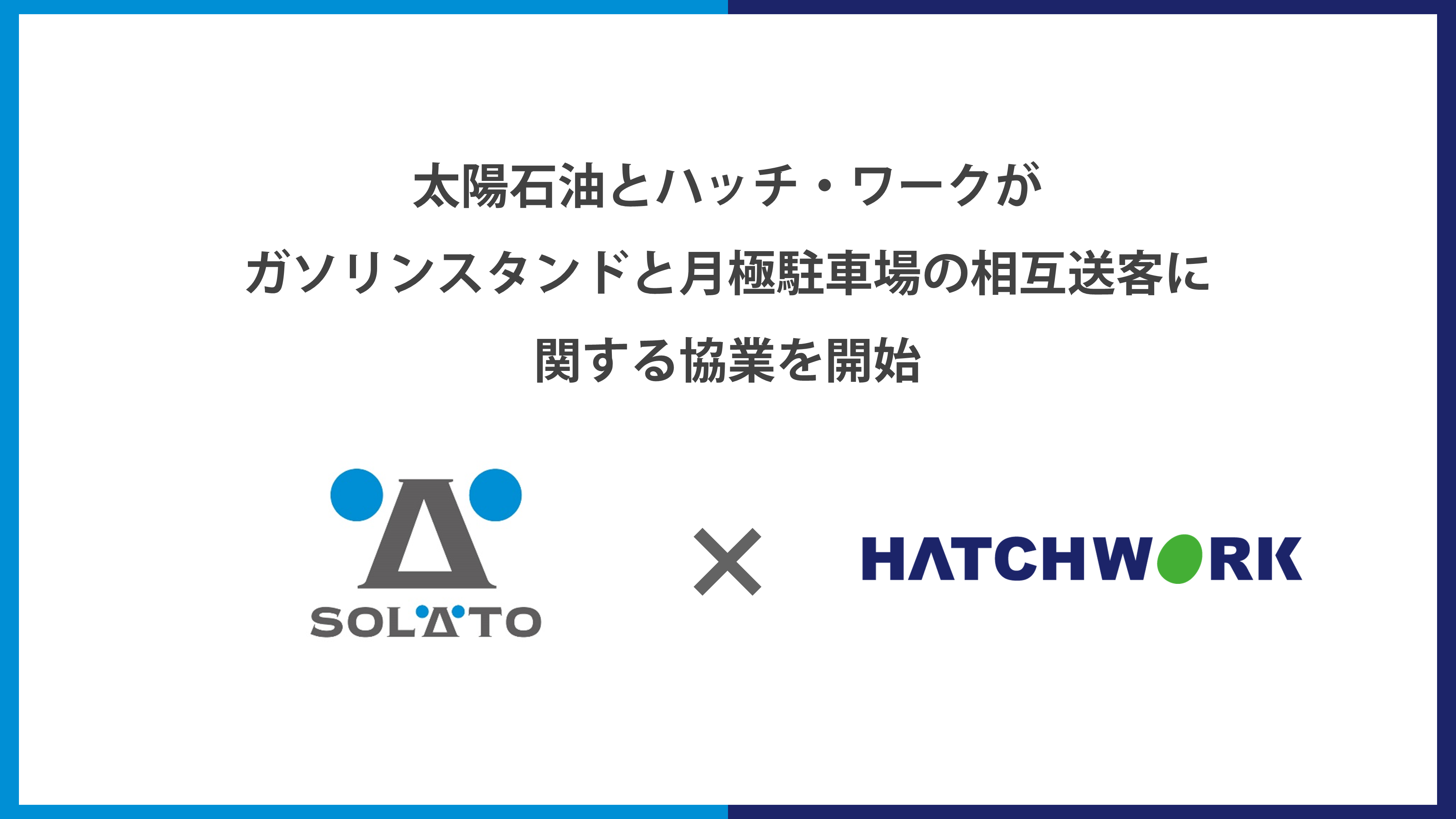 株式会社ハッチ・ワーク(本社:東京都港区、代表取締役社長:増田知平、以下「ハッチ・ワーク」)は、太陽石油株式会社(本社:東京都千代田区、代表取締役社長:山本堯大、以下「太陽石油」)と協業し、SOLATO サービスステーション(以下「SOLATO SS」)と月極駐車場の相互送客に関するキャンペーンを、2025年10月1日から愛媛県内で開始いたします。