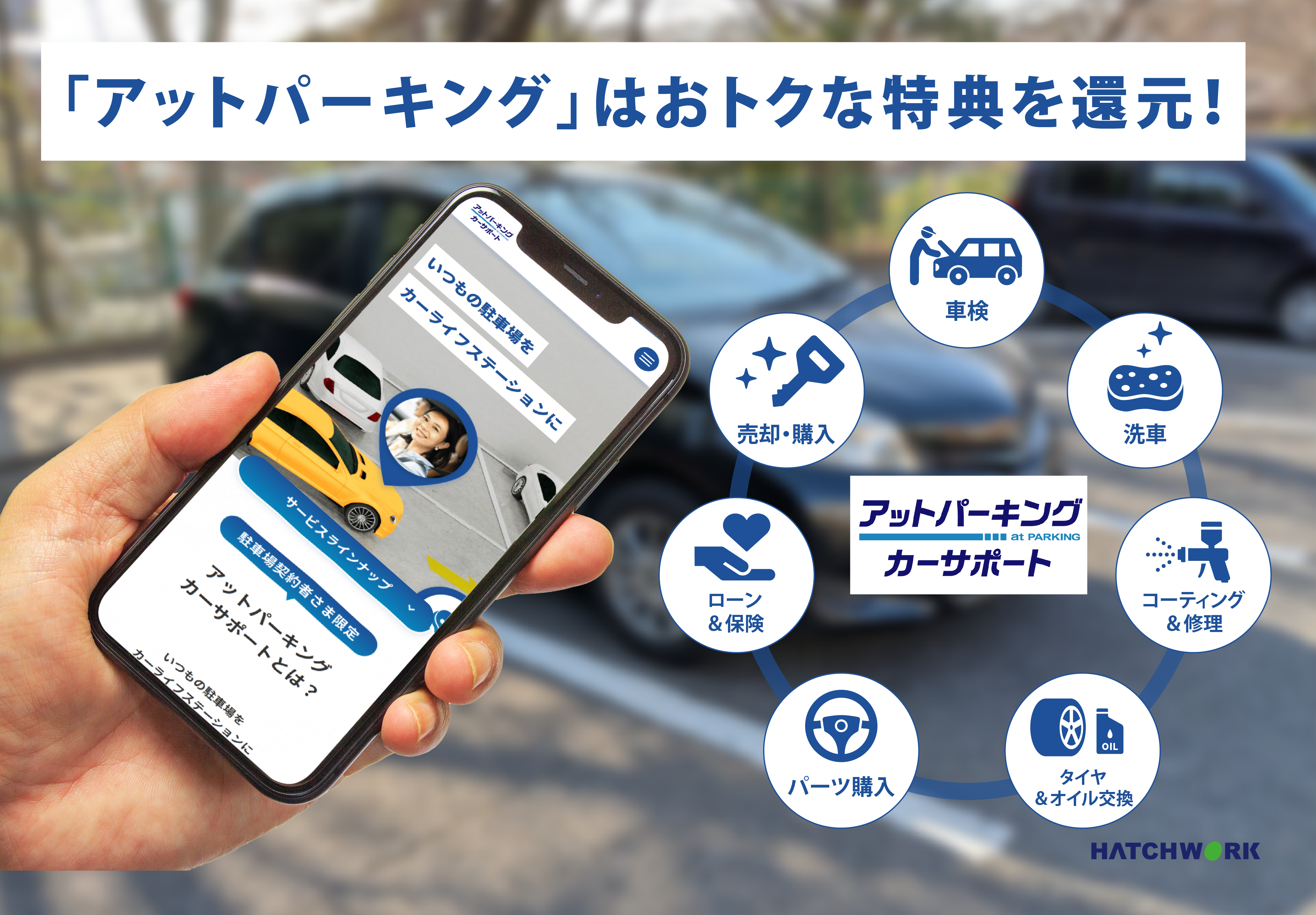 月極駐車場は長期間利用するため、利用者に対する継続的な「お得感」を提供することが重要と考えています。そこで、ハッチ・ワークは「利用者への特典還元」をコンセプトに、利益を目的とせず、当社および提携先企業の費用負担によって、クルマの洗車、売却・購入、コーティング、キズ・ヘコミ修理、車検・点検、タイヤ・オイル交換、パーツ購入、ローンや保険など、カーライフ全般をサポートする「特典付き月極駐車場」という新しい価値を提供しています。