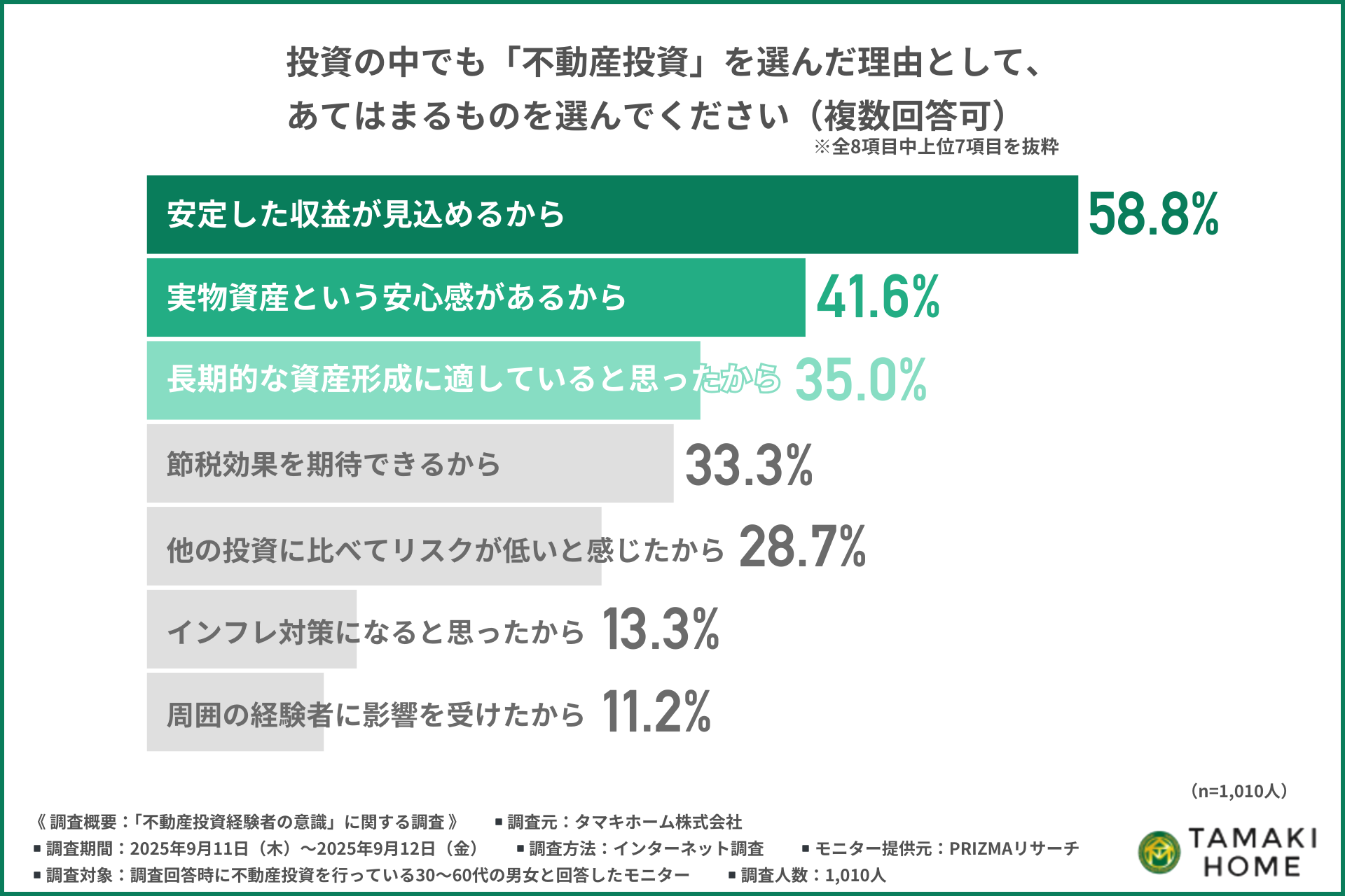 はじめに、「投資の中でも不動産投資を選んだ理由」について尋ねたところ、『安定した収益が見込めるから(58.8%)』と回答した方が最も多く、『実物資産という安心感があるから(41.6%)』『長期的な資産形成に適していると思ったから(35.0%)』と続きました。
