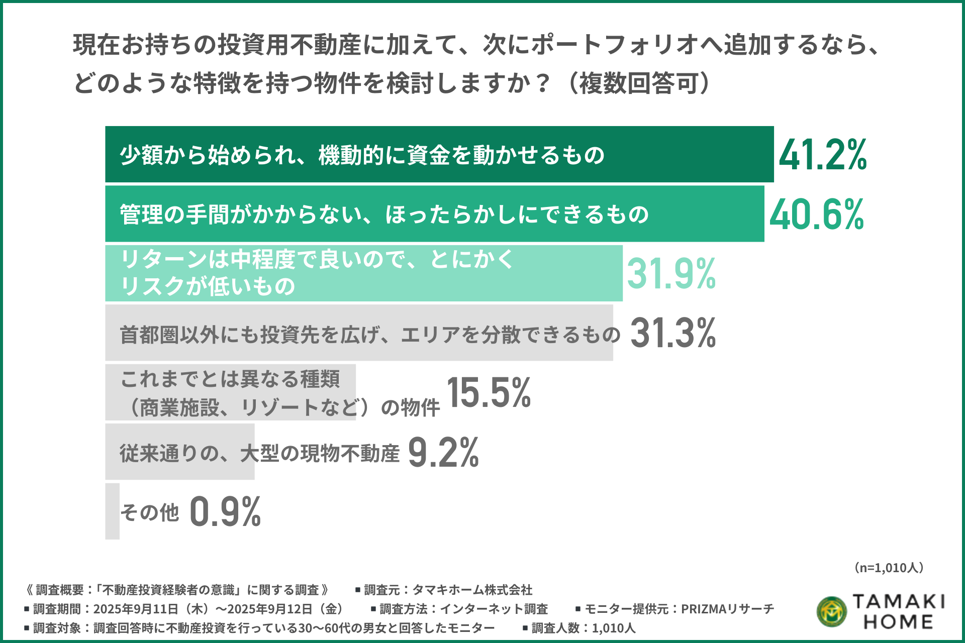 ポートフォリオへの追加で求められている物件の特徴としては、「少額から始められる」「管理の手間がかからない」といった手軽さが重視されており、また「リスクを抑える」姿勢がより顕著に見られます。こうしたニーズは、従来型の大型物件重視からの変化を反映しているといえます。