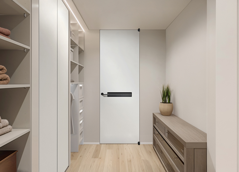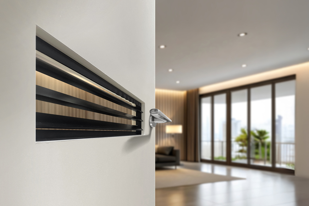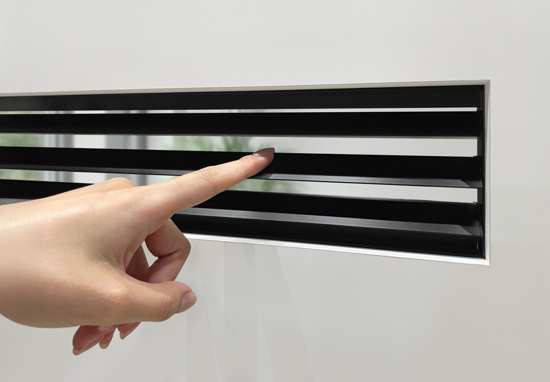 そこで当社は、通気機能を持たせたルーバードア「ポルク」を開発いたしました。通気部分にはスタイリッシュなアルミ製ルーバーを採用し、指先でタッチするだけでスムーズに開閉することが可能。これまでのような、大きいルーバーが全面についたものではなく、モダンで洗練されたデザインにもこだわりました。