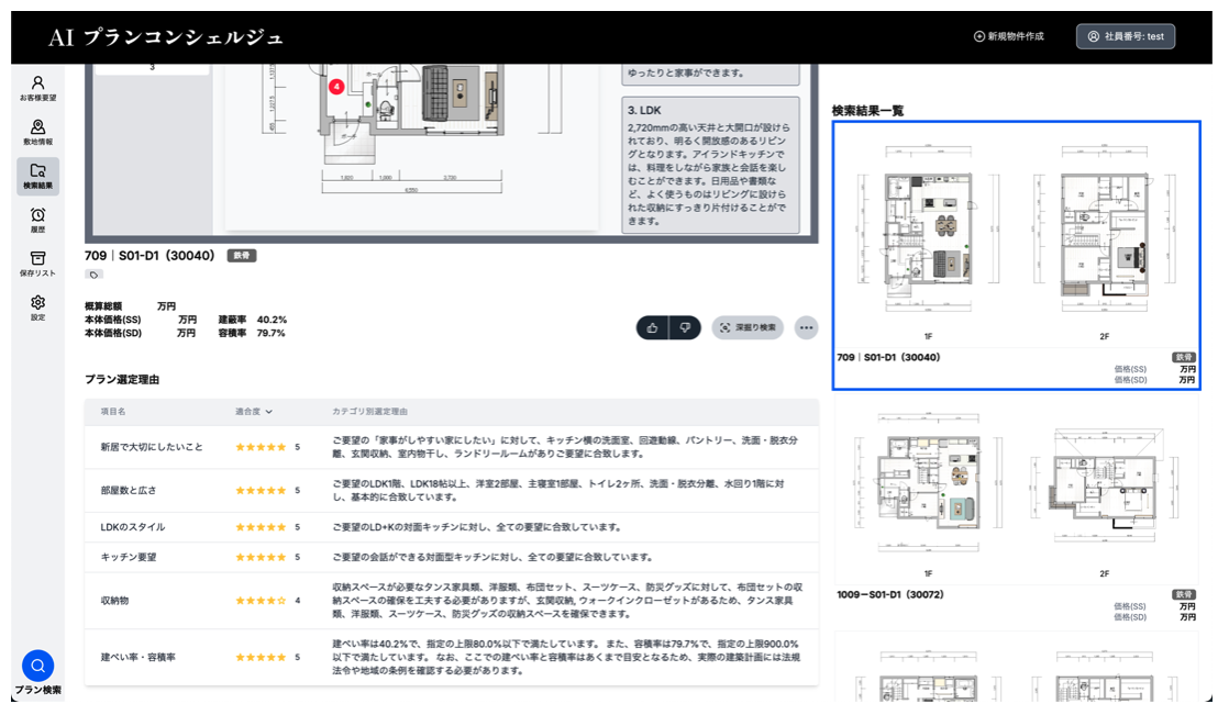 ・お客さまのご要望と、住宅図面を統合的に自動解析して得たプランの特長を踏まえ、検索されたプ