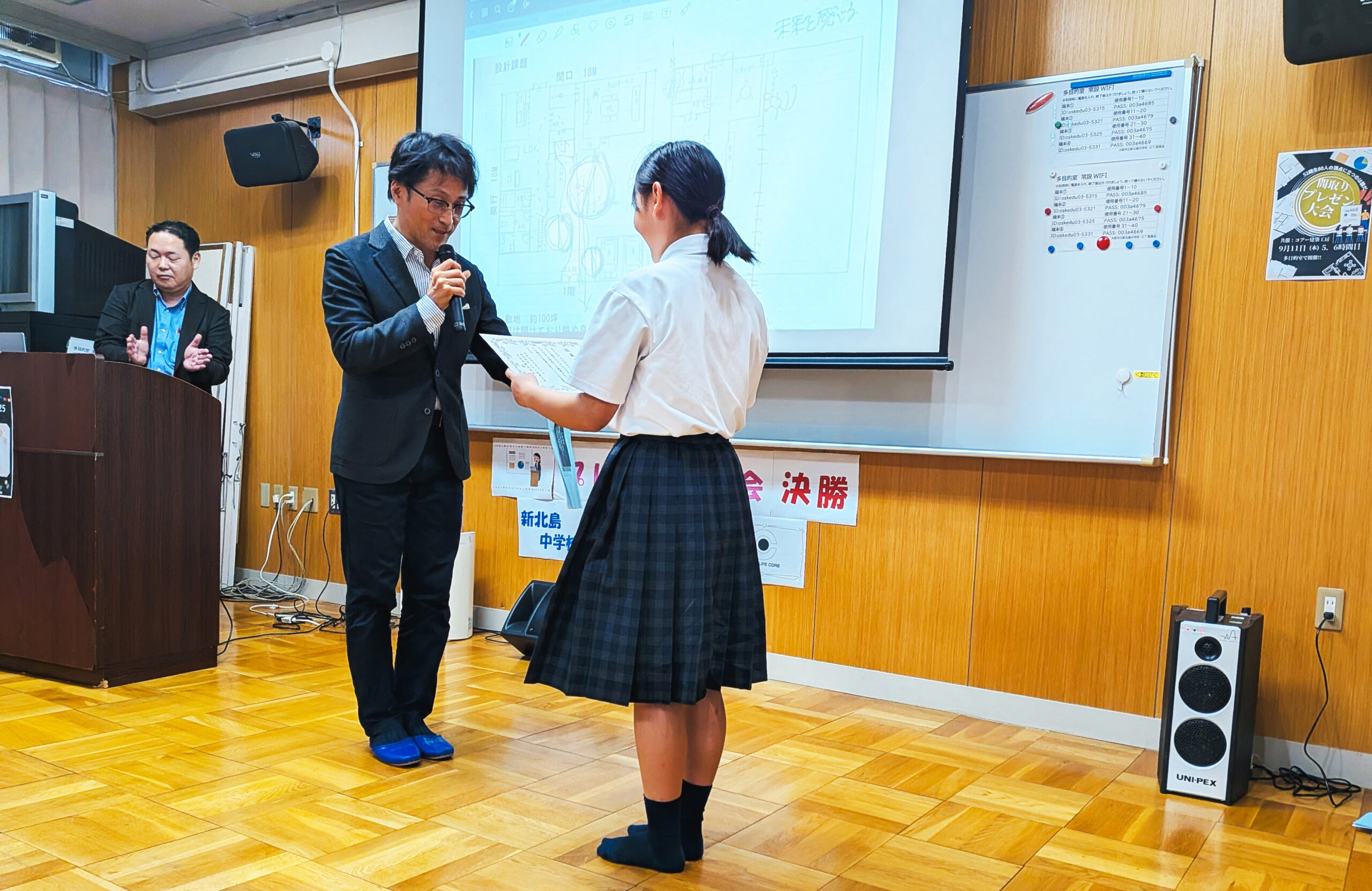 9月11日には、80名の作品の中から選ばれた11名がプレゼンテーションを行い、会場には生徒たちのポスターや発表者以外の図面も展示され、オープニングムービーと共に3か月にわたる学びの成果が温かな雰囲気の中で披露されました。