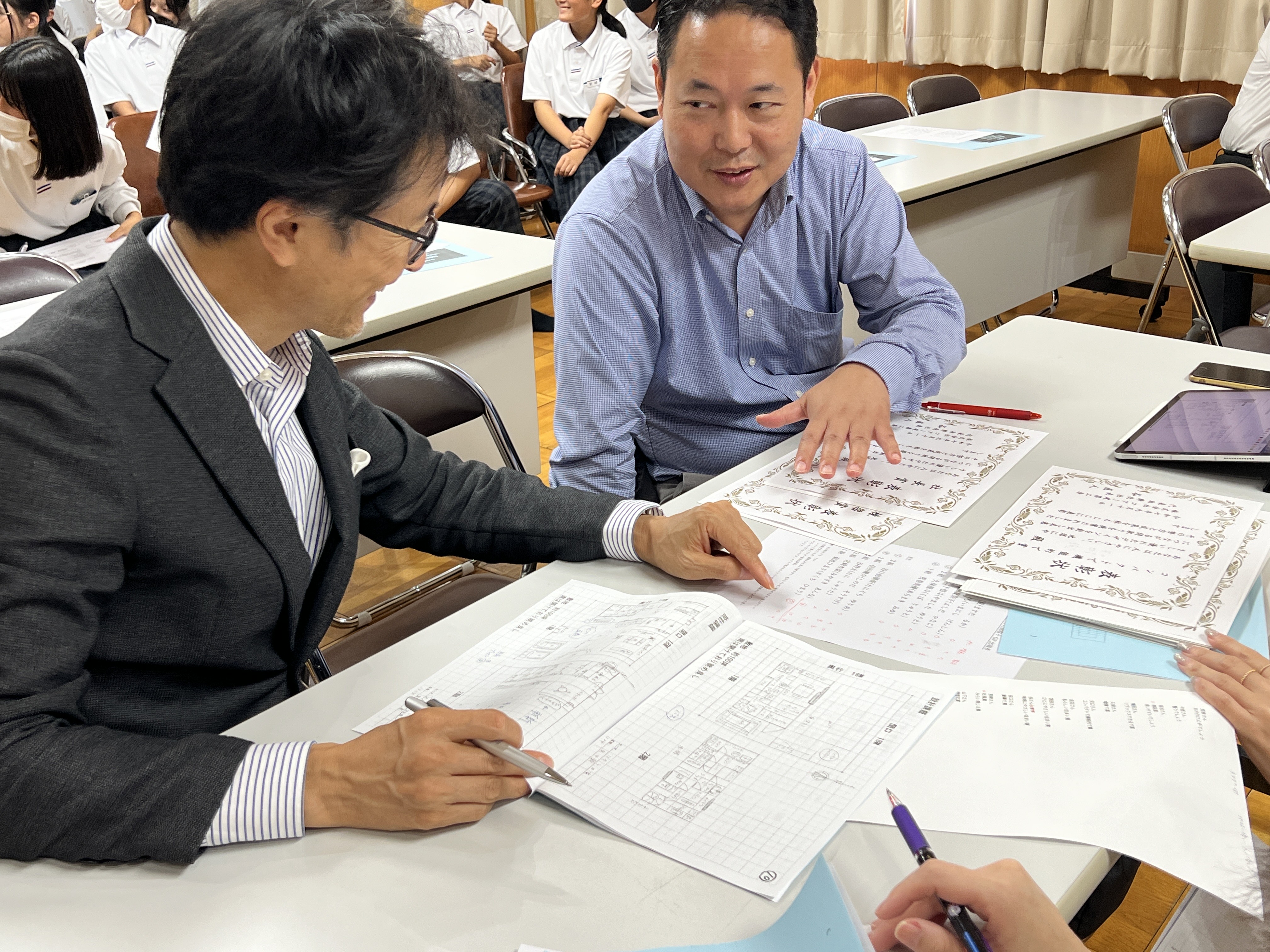 本発表会は、7月の授業課題「未来の間取りをつくろう」をもとに行われたものです。講師を努めた千原は、「家族とたくさん話して、いい家・間取りを描いてください」というメッセージを伝えました。生徒たちは家族と語り合いながら、地球環境への配慮や人が心地よく暮らせる工夫を盛り込み、それぞれの“わが家らしい住まい”を図面に描き上げました。