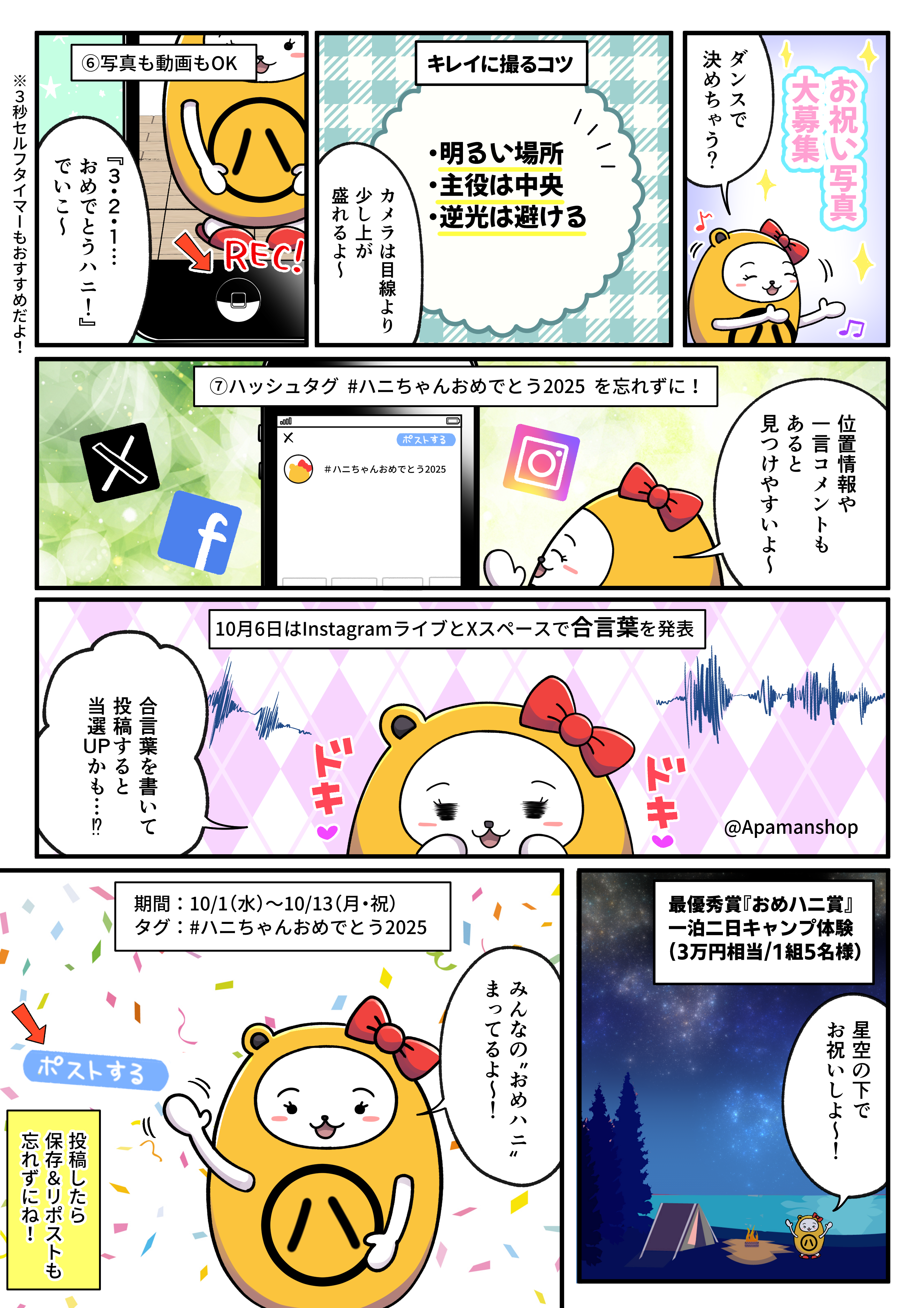 1.アパマンショップ公式アカウントをフォロー 2.投稿に #ハニちゃんおめでとう2025 を必ず1つ付与(公開アカウントが対象) 3.“お祝いメッセージ”とともに、画像/動画/イラスト/ARショット等を期間内に投稿 |