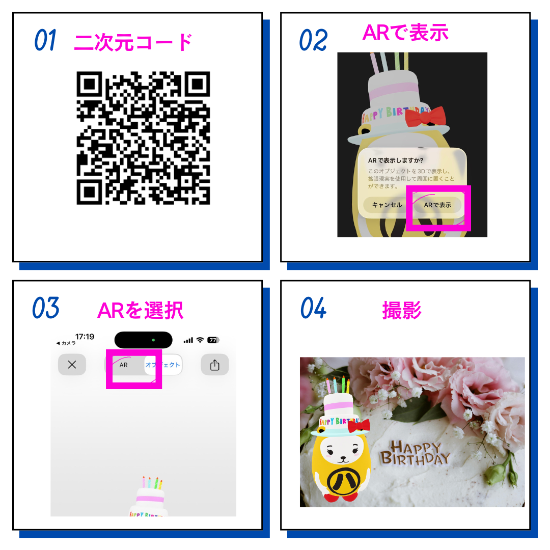 二次元コードをスマホで読み取るだけで、ハニちゃんが目の前に登場します!アプリ不要で、すぐにAR体験が楽しめます。お気に入りの場所で写真を撮り、SNSに投稿してみてください。