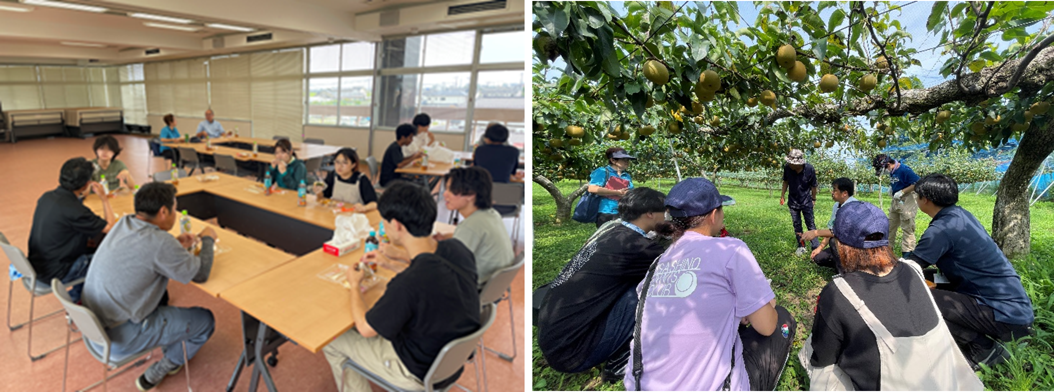 お昼は現地の梨の生産者の方と昼食を取り交流を行い、貴重なお話を聞くことができました。その後、収穫も行い、みずみずしい梨をいただきました。