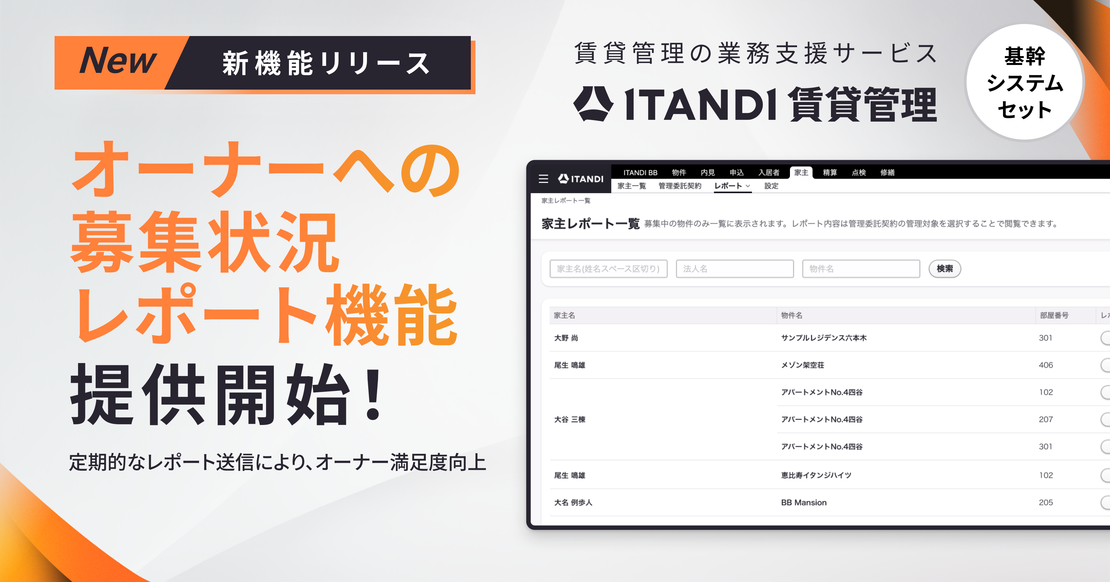 テクノロジーで不動産取引をなめらかにするイタンジ株式会社(以下「当社」)は、当社が提供する賃貸管理の業務支援サービス「ITANDI 賃貸管理」の基幹システムセットに、不動産オーナー(以下「オーナー」)満足度向上を目的とした、各種新機能を順次提供開始いたします。第一弾として、9月より新たに「募集状況レポート機能」を追加しました。