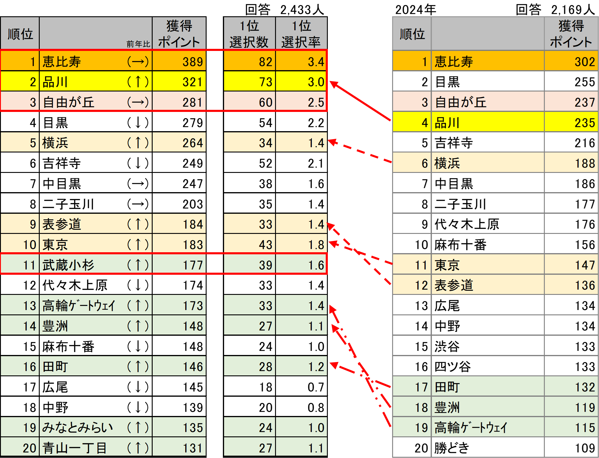 2位は昨年4位からランクアップした「品川」、3位は昨年同様「自由が丘」となっています。