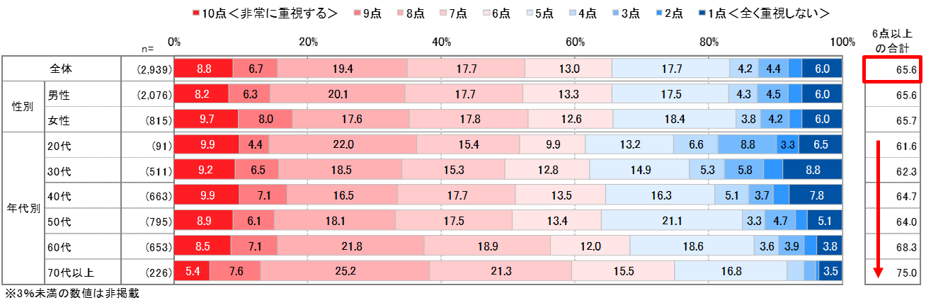 マンション購入を検討する際、「ZEHマンションであること」をどの程度重視するか(10点満点で何点か)尋ねたところ、6点以上と回答した人は65.6%と、全体の2/3に及ぶ結果となりました。