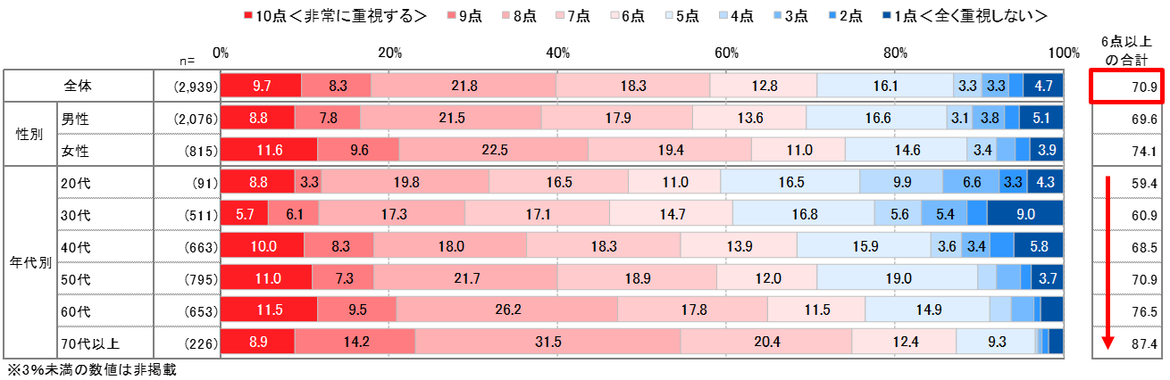 同様に、「住宅省エネ性能ラベルが高いこと」についても尋ねたところ、6点以上と回答した人は70.9%と、7割を超える結果となっています。