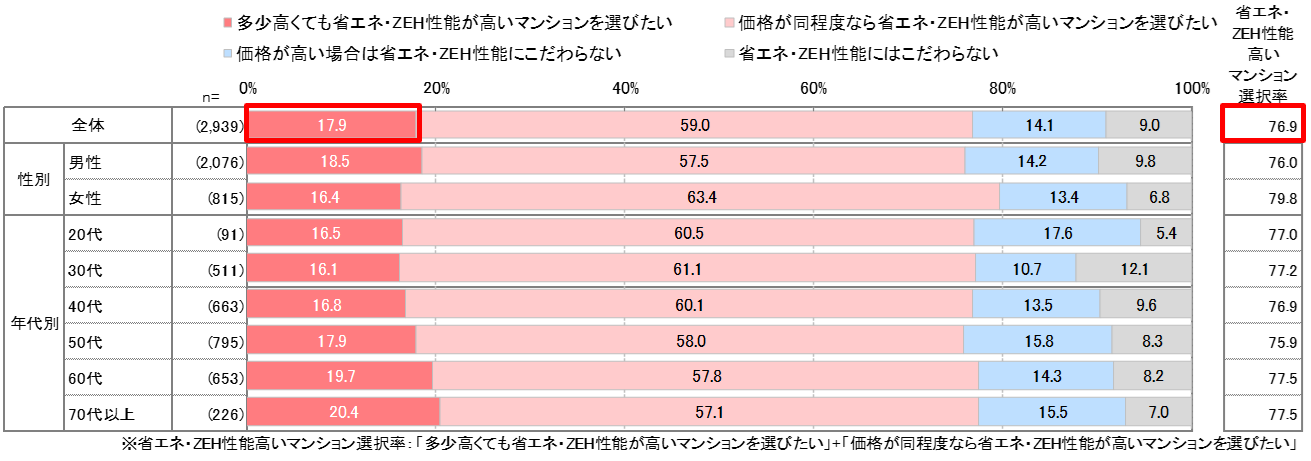 「省エネ・ZEH性能が高いマンションを選びたい」と回答した人は7割後半