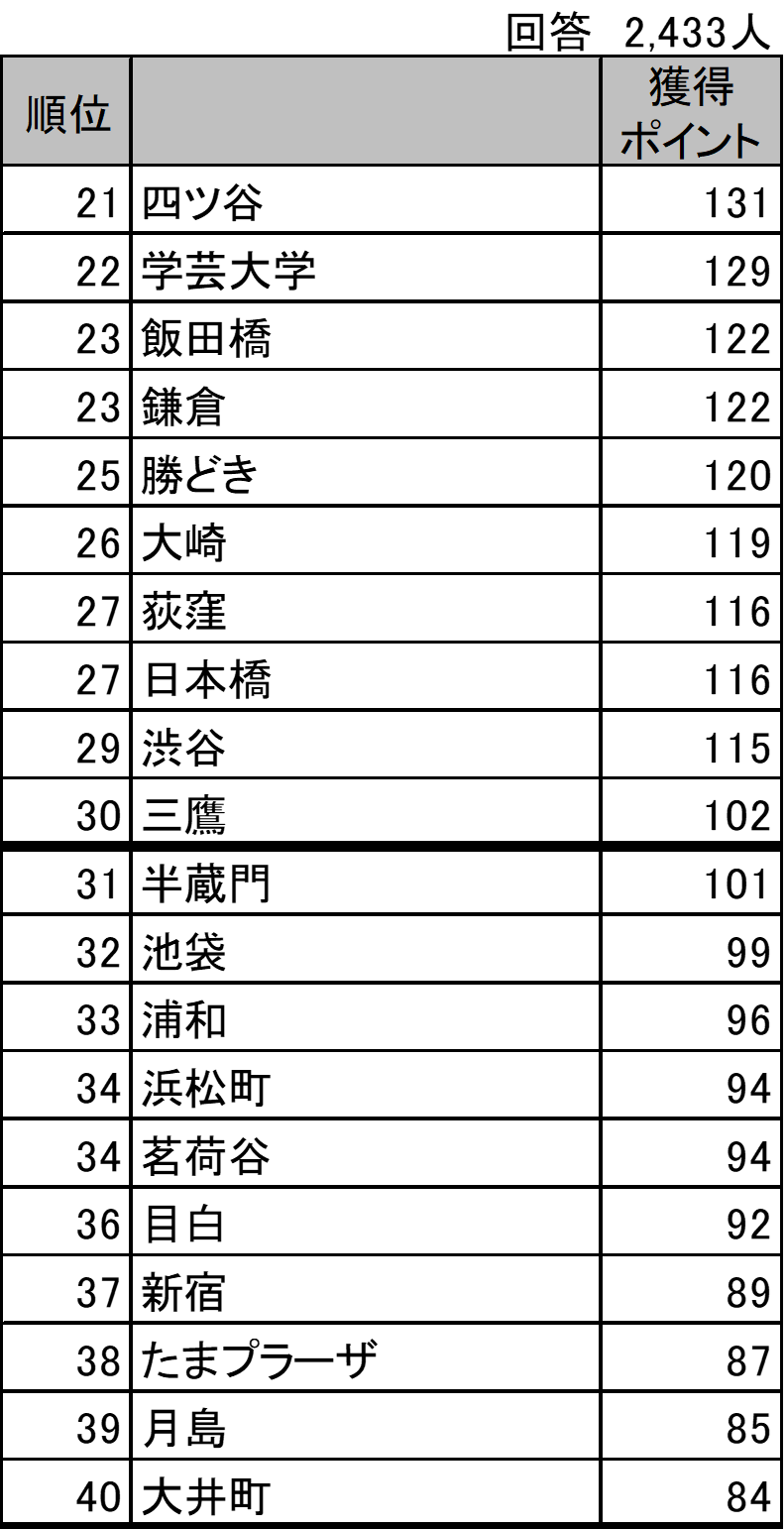 ※アンケートでは駅名表記にしております。(例)恵比寿駅、横浜駅、東京駅など