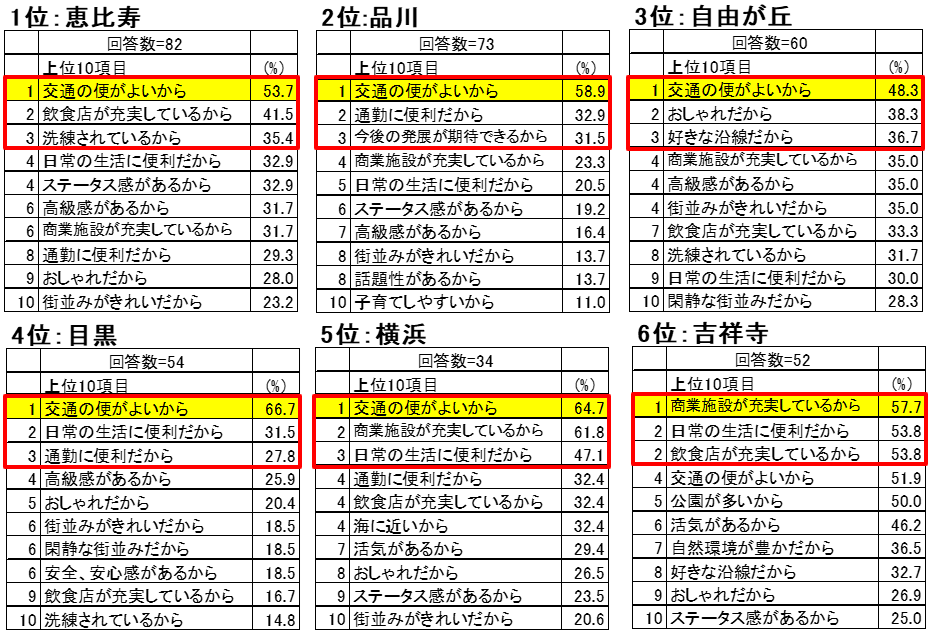 2位「品川」、3位「自由が丘」、4位「目黒」、5位「横浜」、6位「吉祥寺」