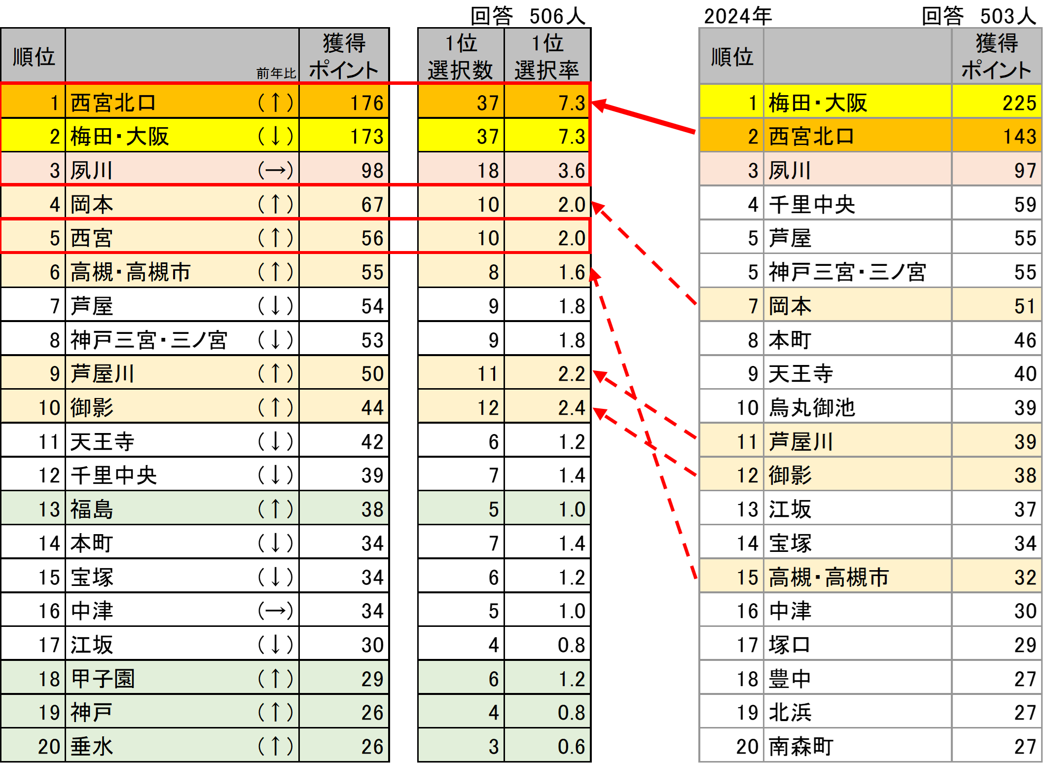 [関西圏] 1位「西宮北口」※昨年2位から、2位「梅田・大阪」、3位「夙川」