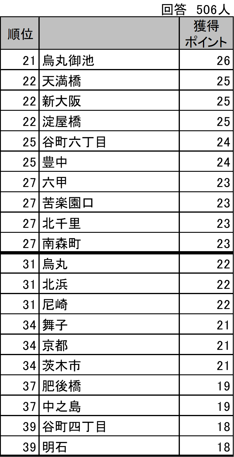 関西圏のランキングは、昨年2位の「西宮北口」が176ポイントを獲得し、トップとなりました。