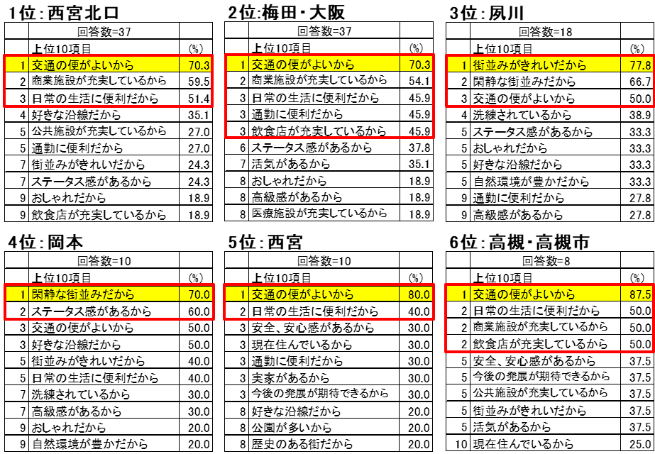 街ごとに理由をみると、「西宮北口」「梅田・大阪」は交通の便がよい、商業施設が充実、日常の生活に便利、「夙川」は街並みがきれい、閑静な街並み、交通の便がよい、「岡本」は閑静な街並み、ステータス感、「西宮」「高槻・高槻市」は交通の便がよい、日常の生活に便利などが上位に挙げられました。
