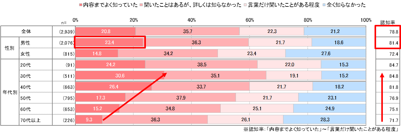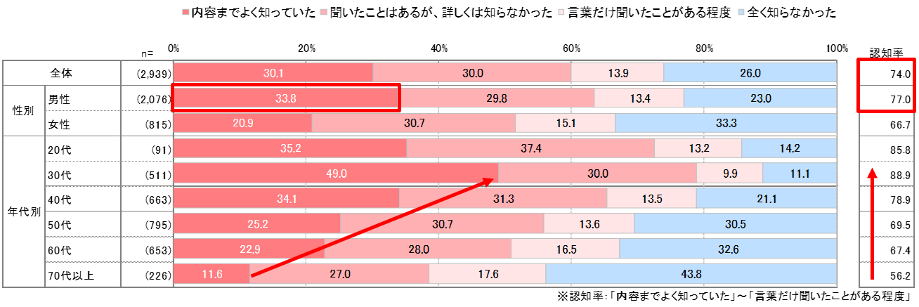 性別では男性、年代では低年代(30代がピーク)ほど、認知度が高い