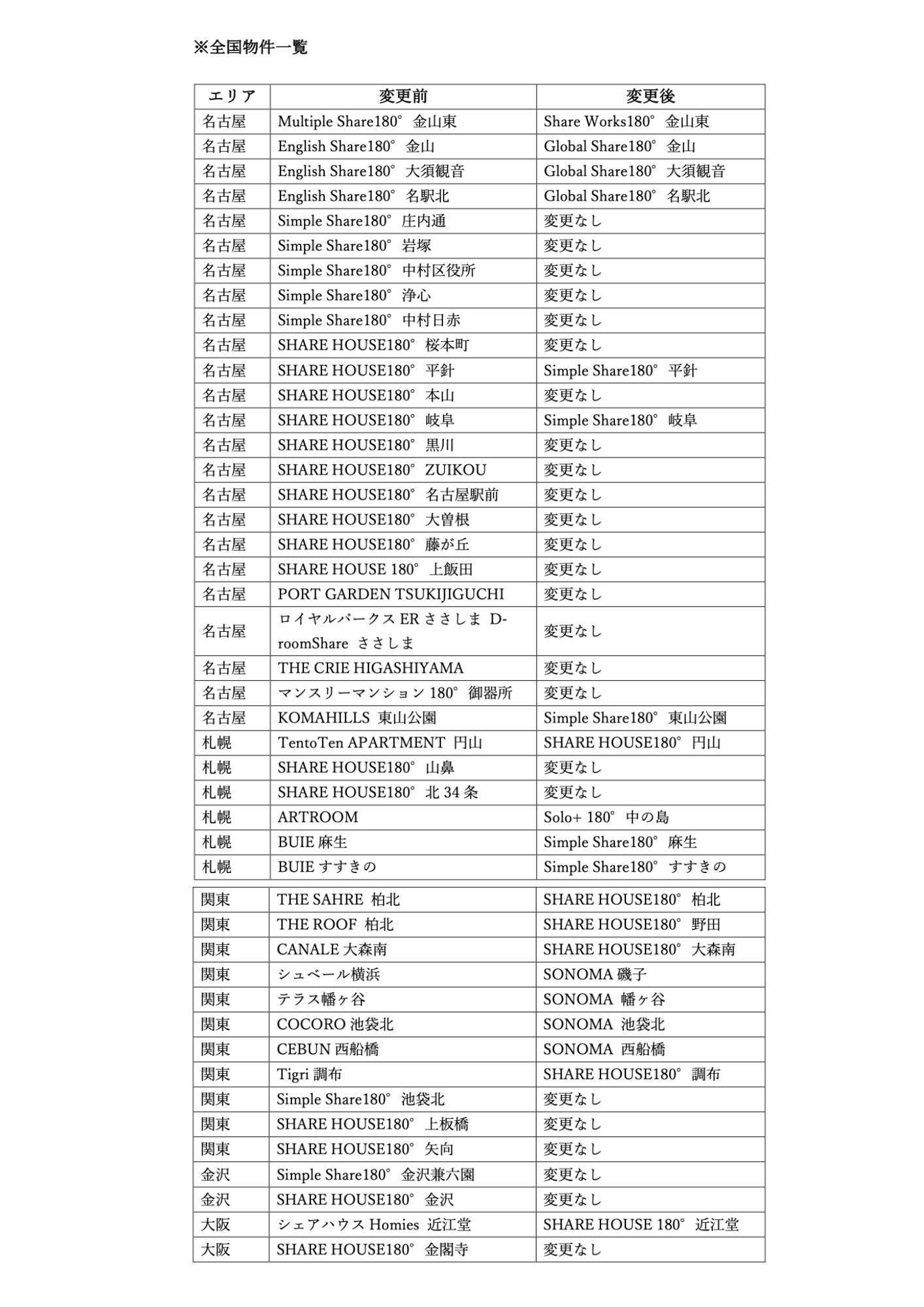 株式会社シェア180(本社:愛知県名古屋市昭和区福江二丁目1番31号、代表取締役:伊藤正樹)は、2025年10月1日より、全国で運営するシェアハウス20棟において、ブランド体系の統一を実施いたします。これにより、より明確で一貫性のあるブランド体験を提供し、入居検討者、オーナー様、そして既存の入居者の皆さまにとって価値ある住環境をお届けしてまいります。