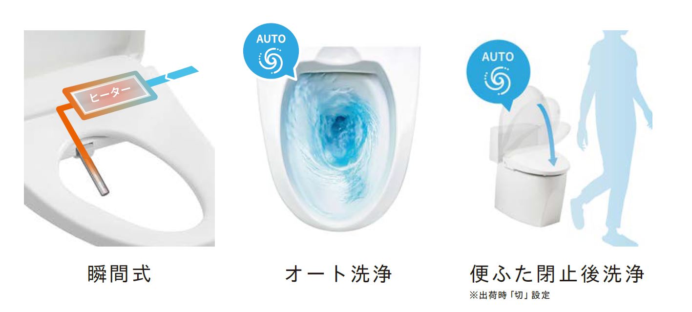 弊社ミドルグレードのタンク式トイレ「キュアーズ」シリーズ搭載便座としては、初のフルオート温水洗浄便座です。オート洗浄機能や、人が近づくと自動でふたが開くオート開閉機能、ふたを閉じた後に洗浄を行う便ふた閉止後洗浄機能を搭載しています。