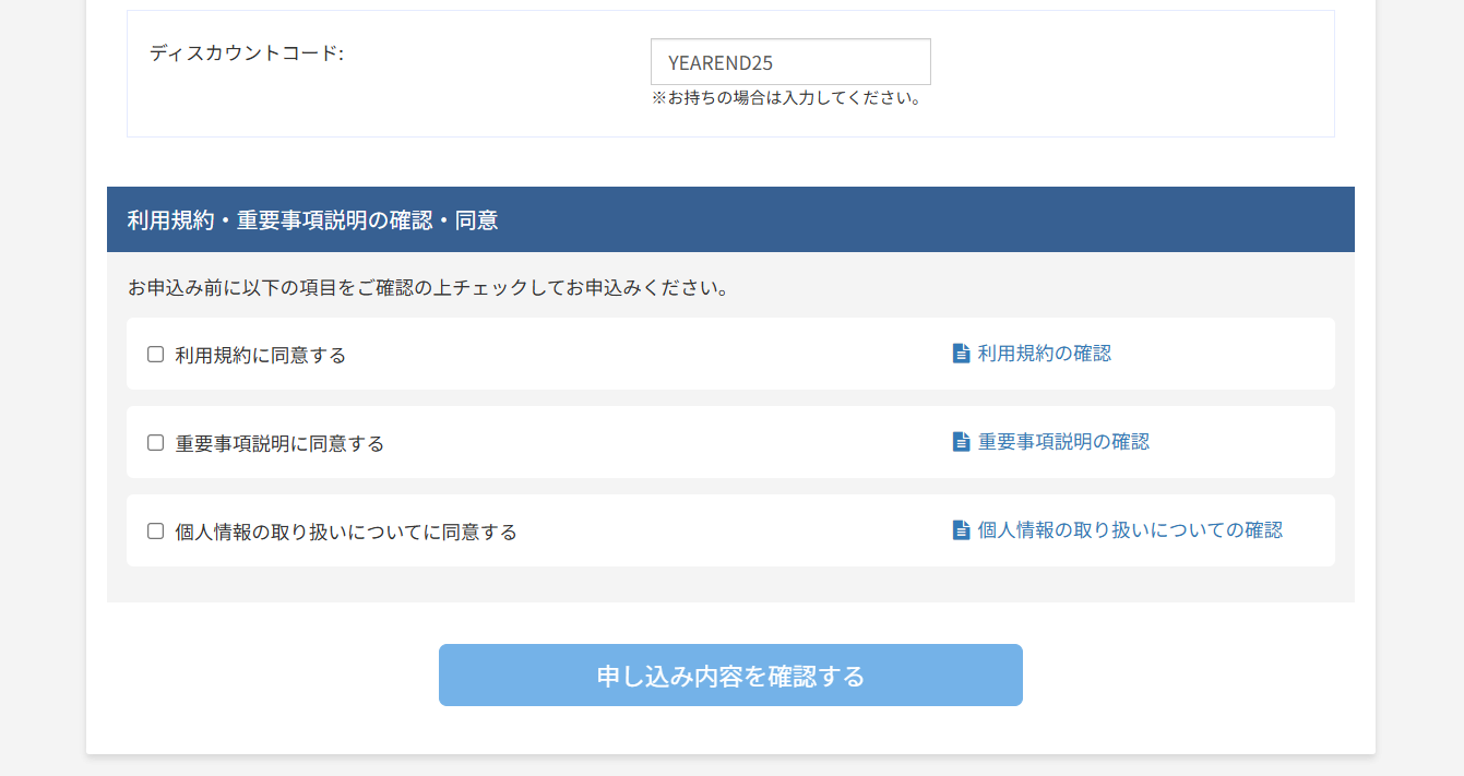 こちらの申し込みフォーム下部のディスカウントコードの欄に「YEAREND25」と入力していただければ参加完了となります。