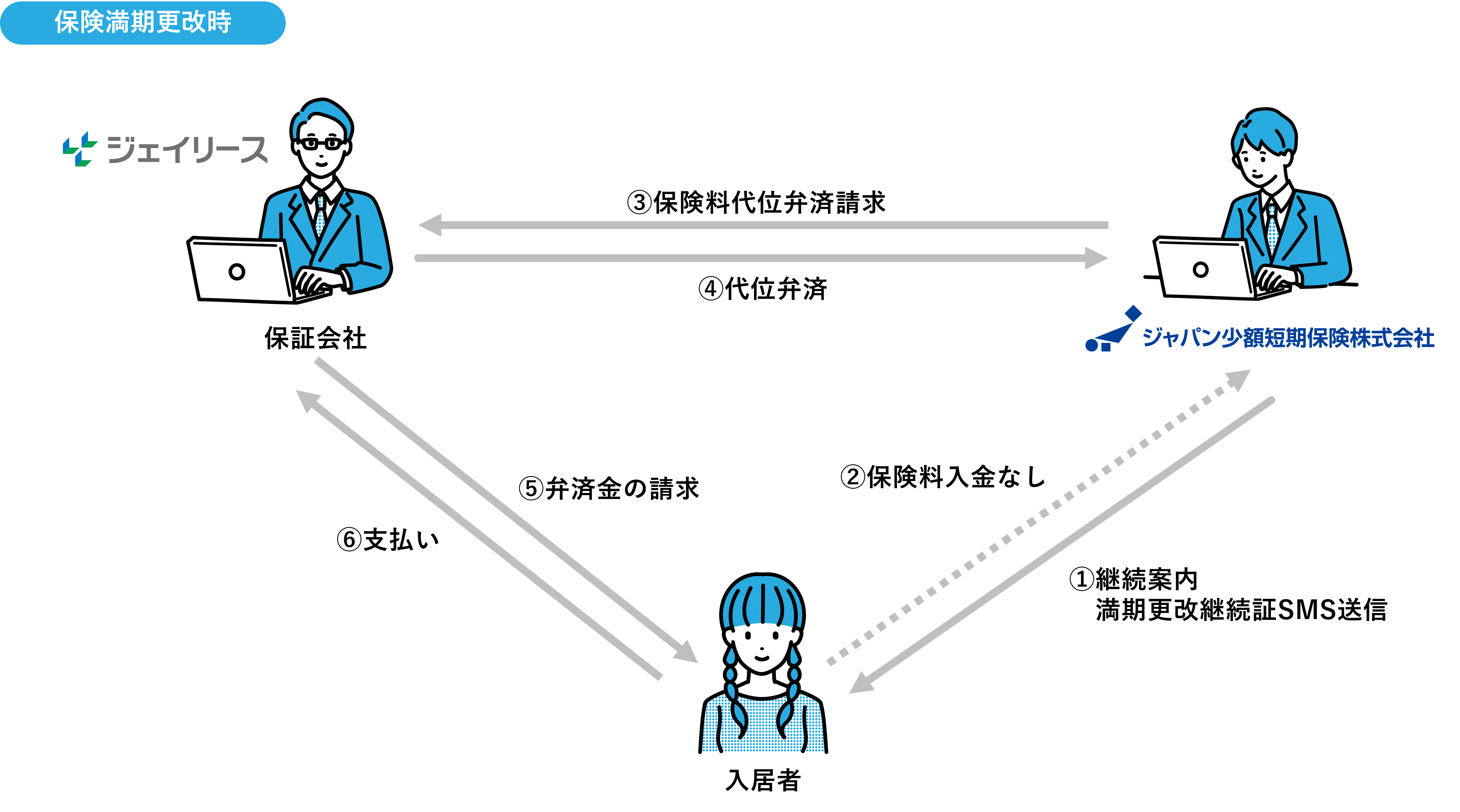 本件は、ジャパン少短と保険契約をする入居者から、契約満期更改時に保険料入金がなかった場合に、ジェイリースが立替払いをするものであり、ジャパン少短は保険料の未収を解消することができ、入居者は無保険となるリスクを防ぐことができます。