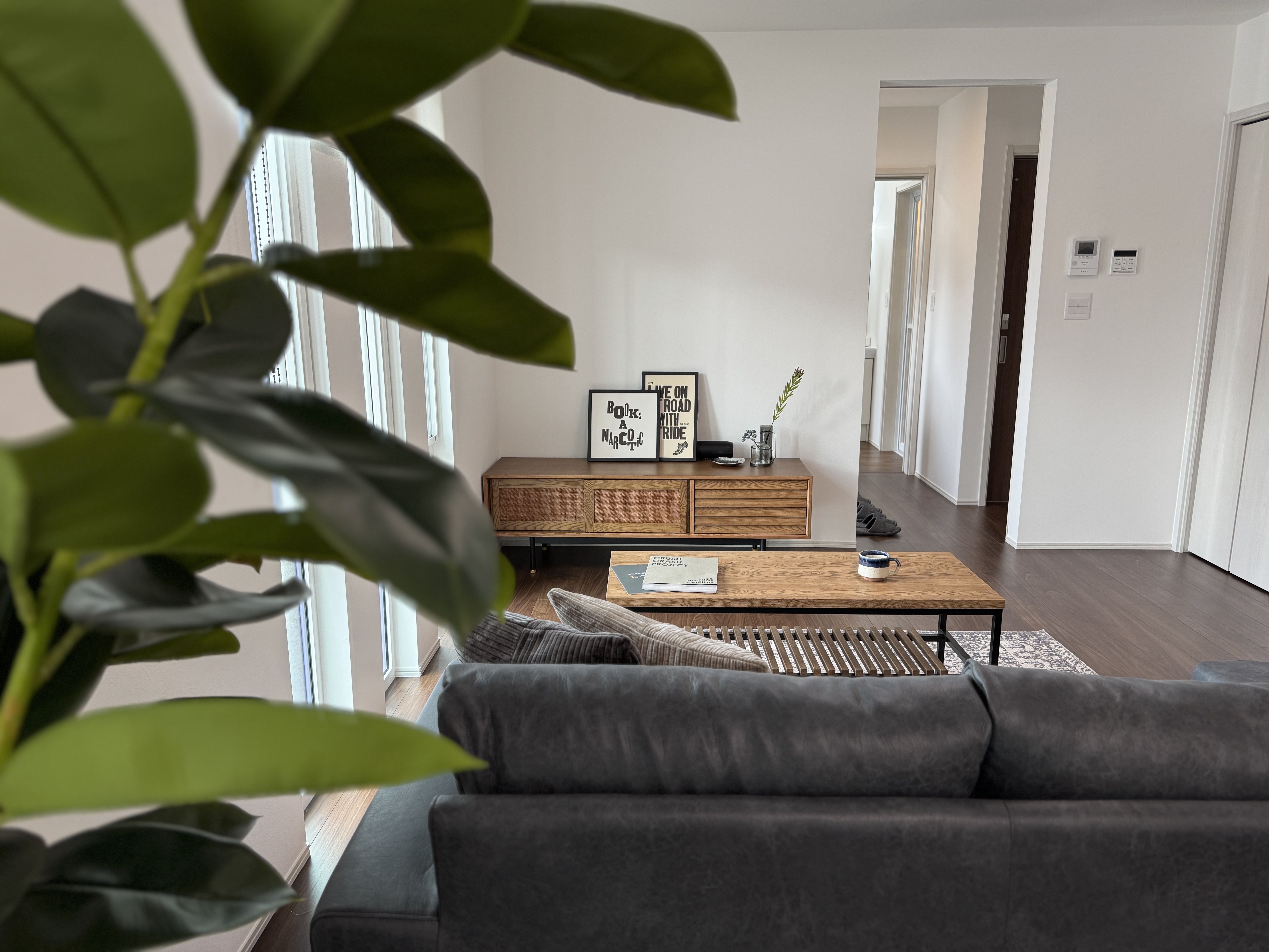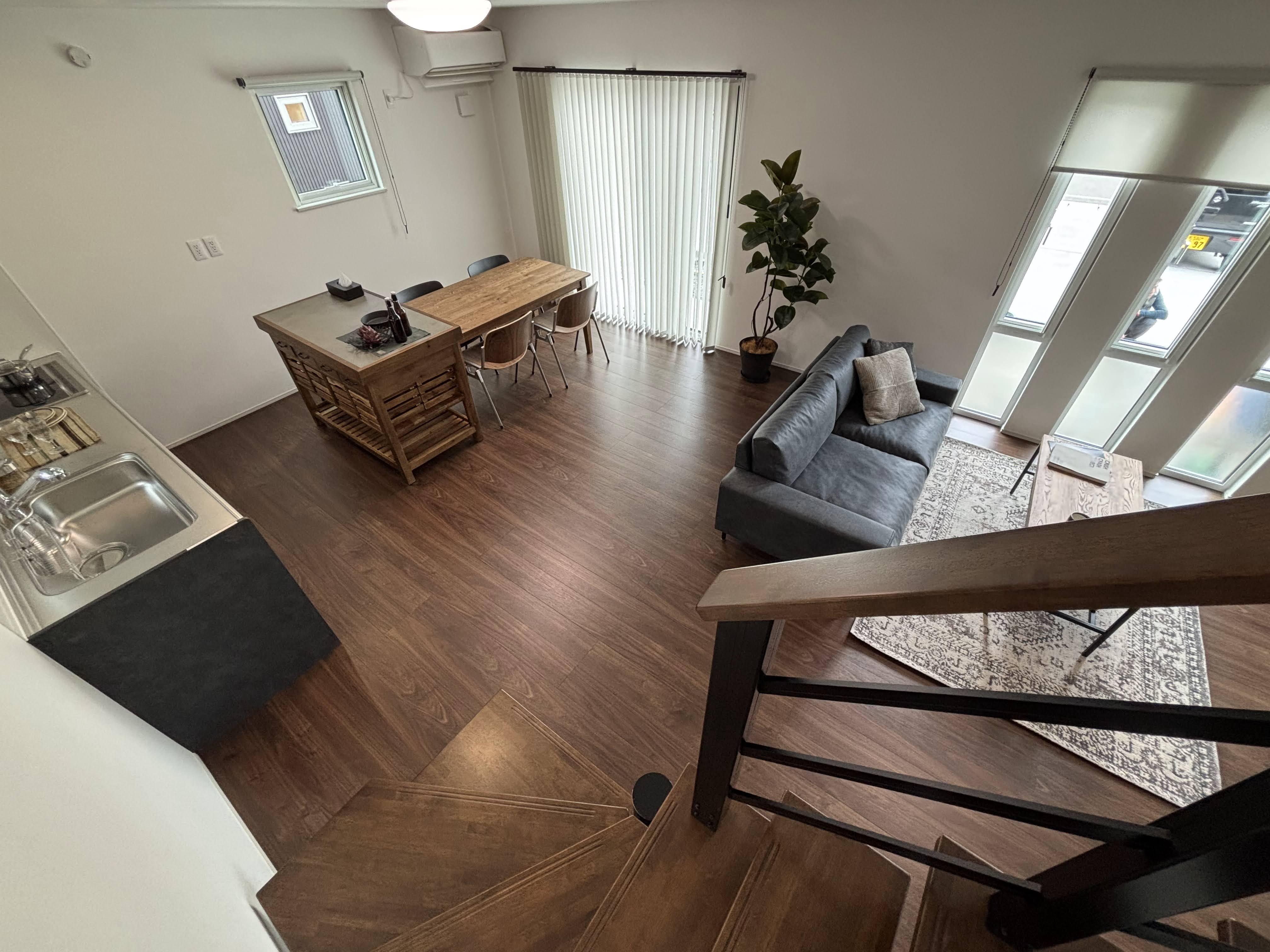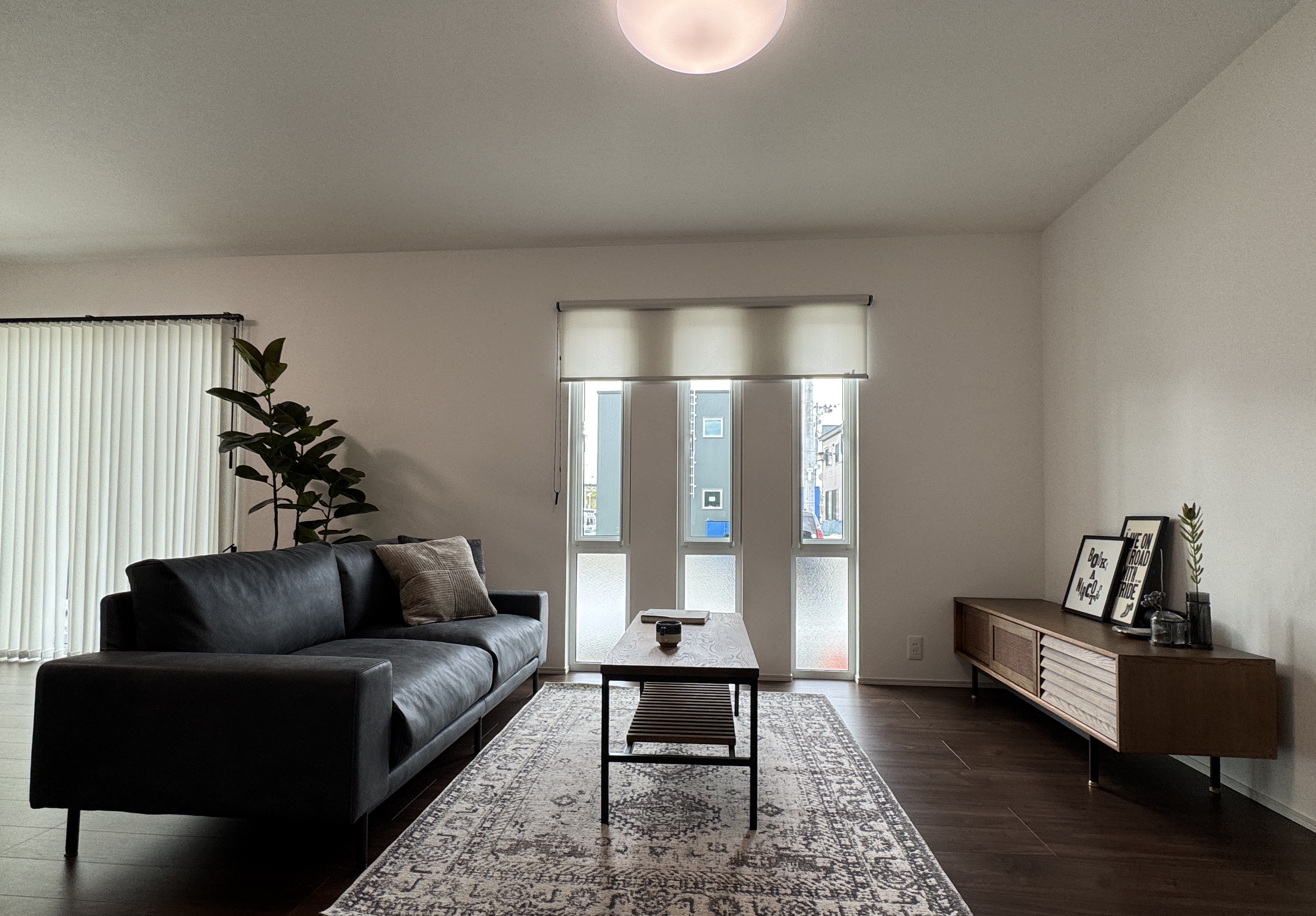 ソファ、ダイニングセット、照明、ラグ、観葉植物まで、プロがトータルコーディネートした統一感ある空間を引き渡し時から実現。